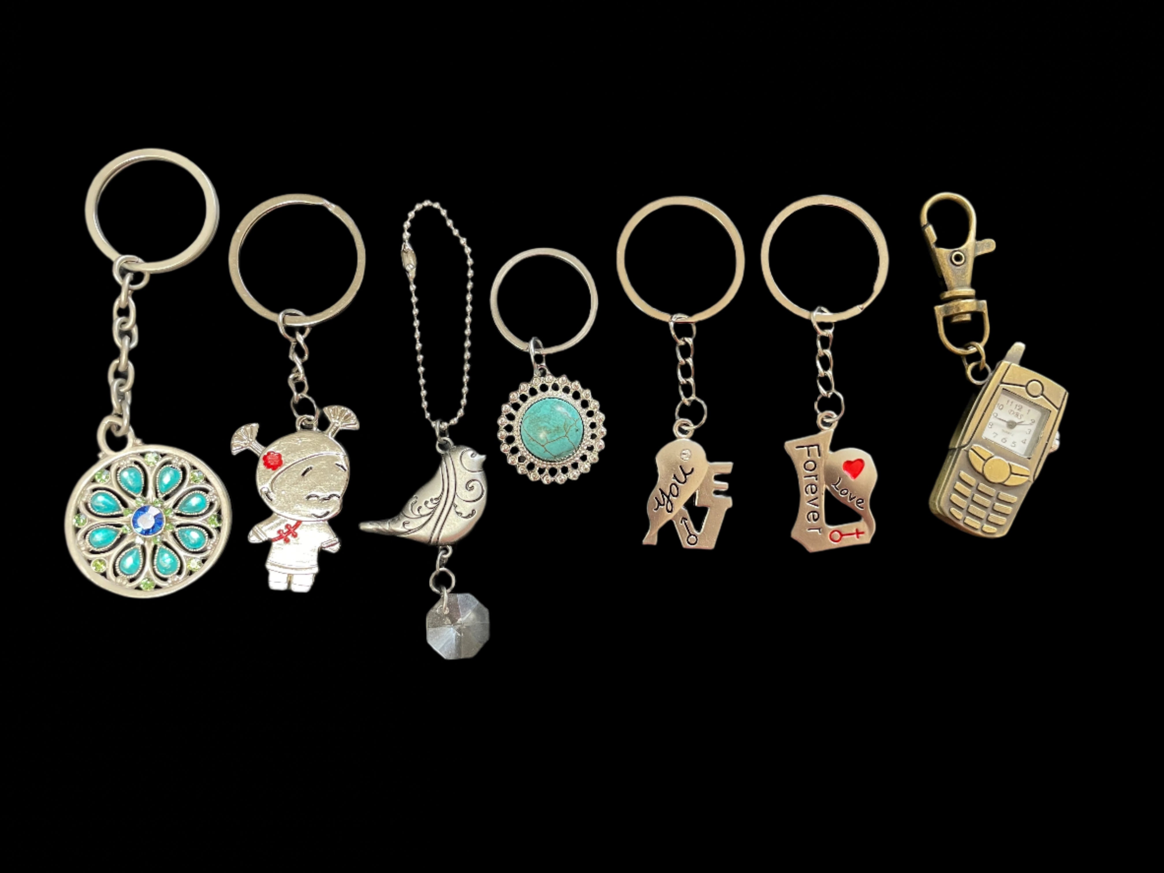 This bundle of 7 unique keychains is full of charm and personality! From a retro cell phone keychain with a clock β° to a crystal bird charm, matching βYou & Meβ heart keys π, and a turquoise medallion πβeach piece is distinct and adorable. Great for gifting, collecting, or adding flair to bags and keys!