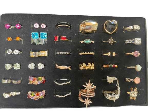 Looking to add some glam to your accessories collection or stock up on goodies for gifting or resale? This 33-piece jewelry lot includes 22 unique rings and 11 pairs of pierced earrings, all neatly arranged in a sleek black velvet display tray. From statement stones to whimsical charms, there’s something here for every mood and outfit! ✨