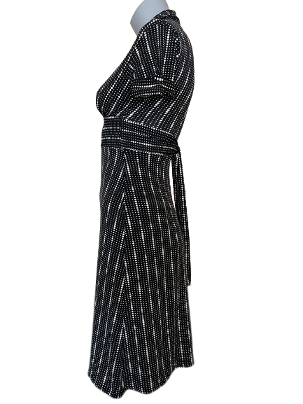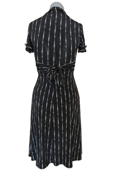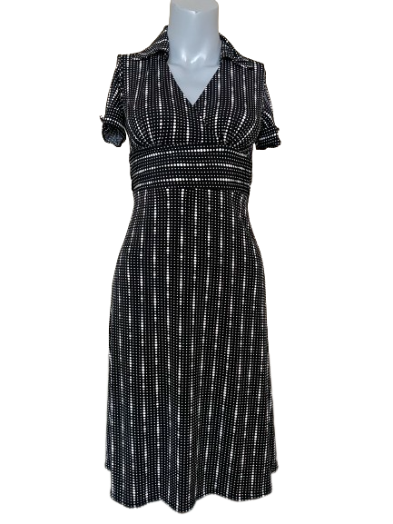 Look sophisticated and feel comfortable in this Le Chateau collared midi dress! The polka dot pattern will add some fun to your wardrobe, while the flowy fabric will have you in style. Get ready for compliments—this dress will have them coming in !