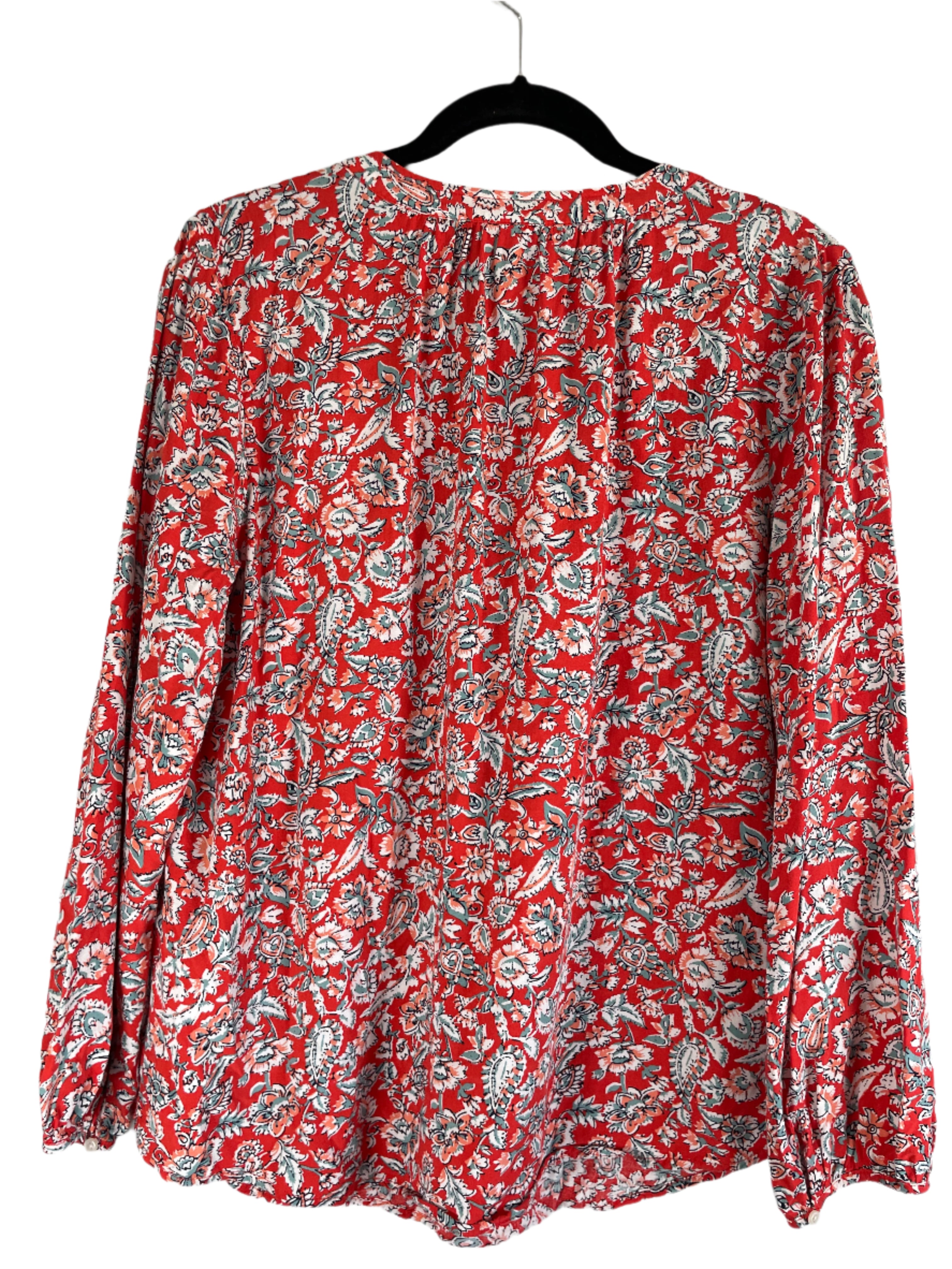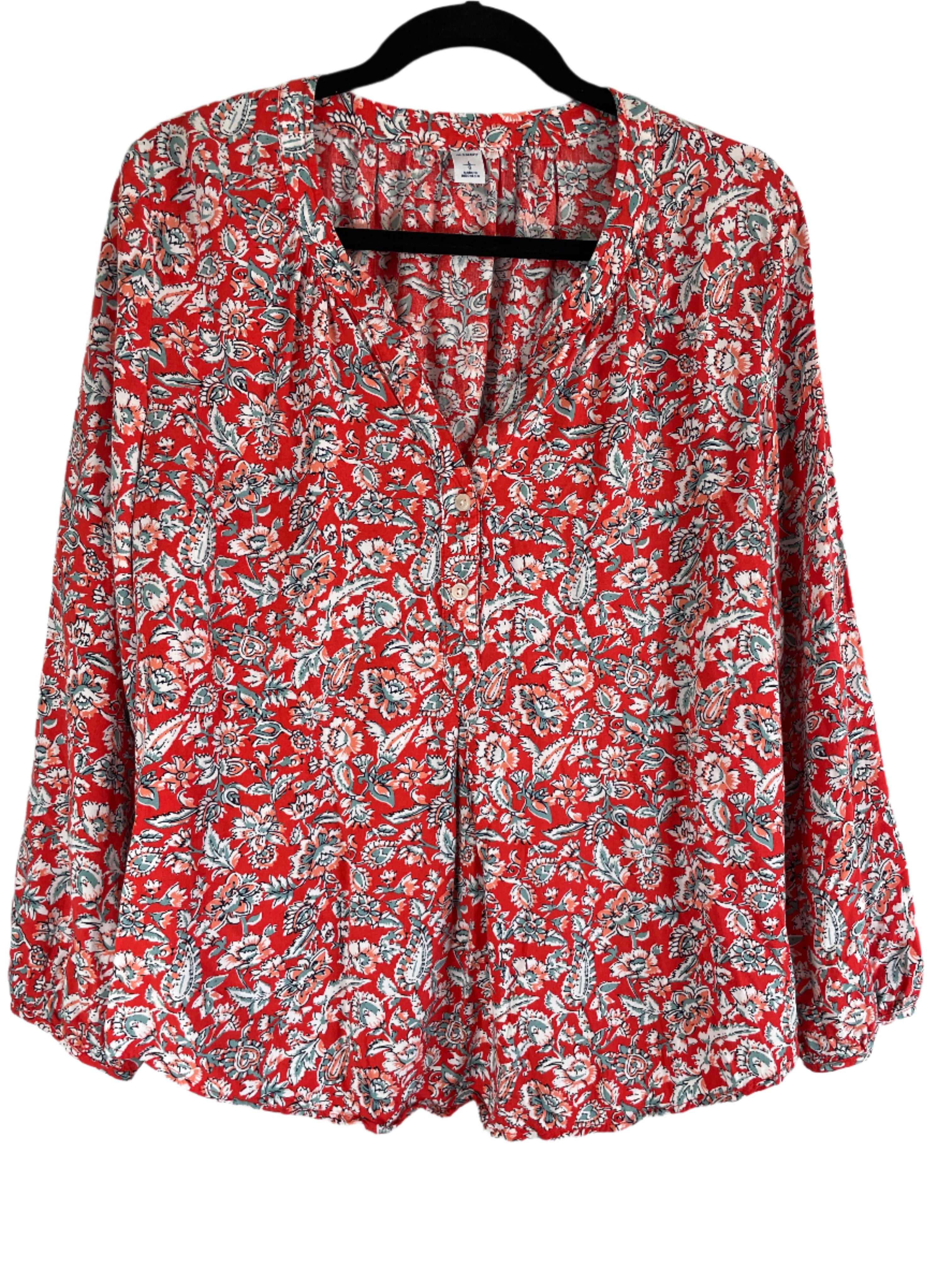 Brighten your wardrobe with this flowy boho blouse by Old Navy in a vibrant red floral print. Made of 100% rayon, it drapes beautifully and features elastic cuffs, a lightweight feel, and a relaxed fit for all-day comfort. Perfect for layering or wearing solo, it blends a touch of vintage charm with modern comfort.