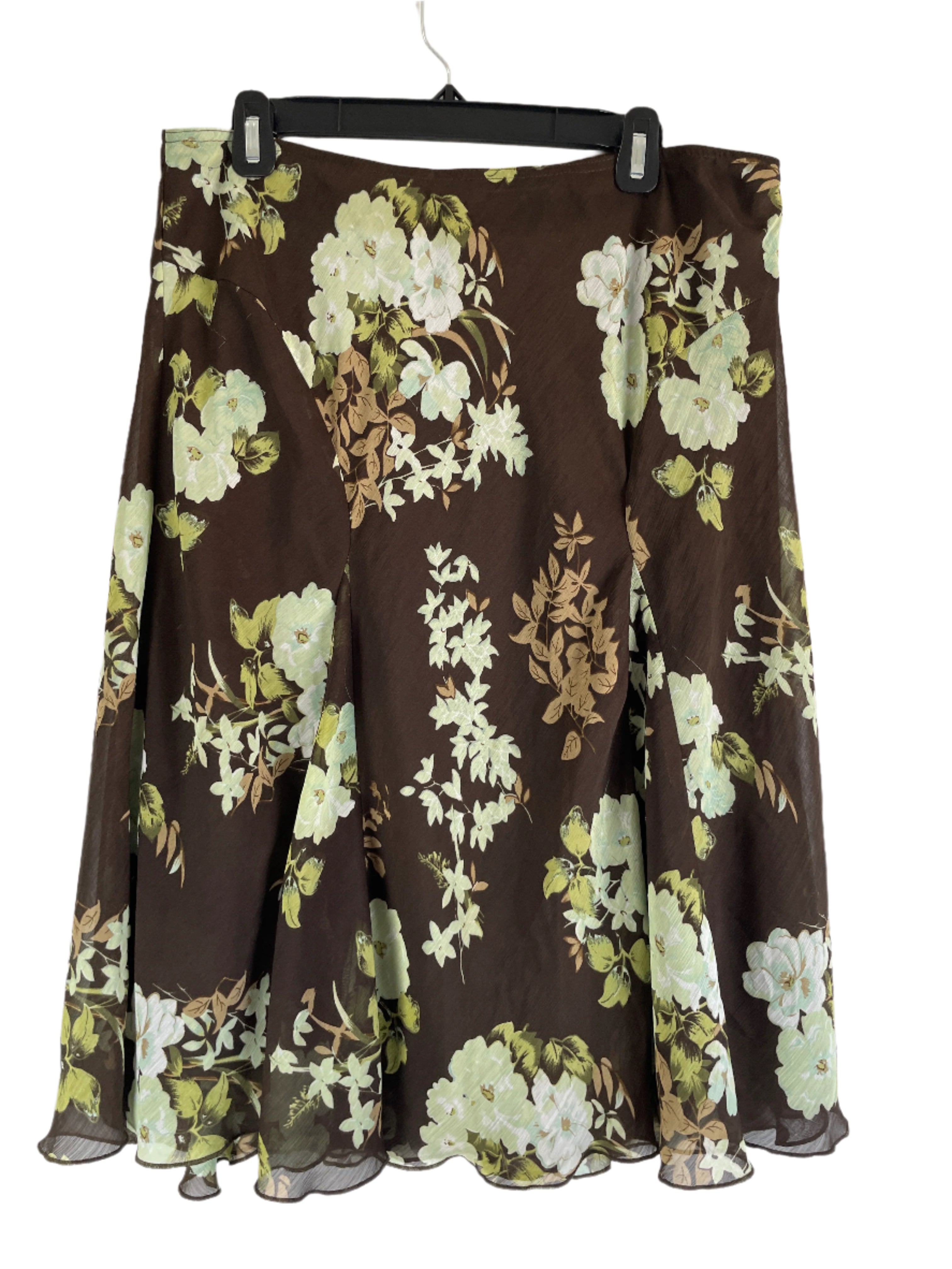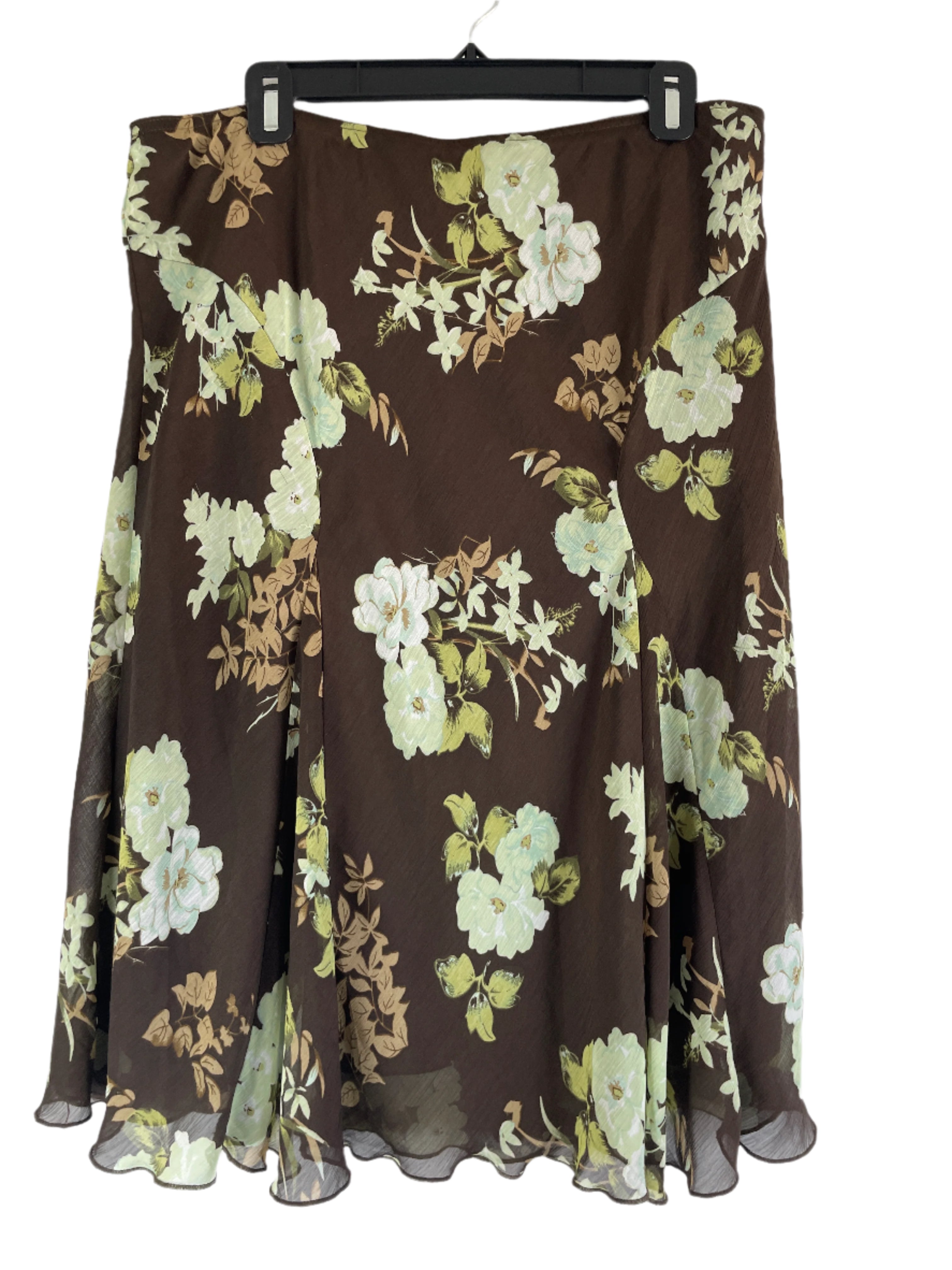 A lovely and flowy floral skirt from Reitmans Petites in rich chocolate brown with green and cream blossoms throughout. Made from 100% polyester, this skirt is fully lined and features an elastic waistband for added comfort. The gentle flare and lightweight fabric give it beautiful movement – perfect for sunny days or layering in cooler weather.