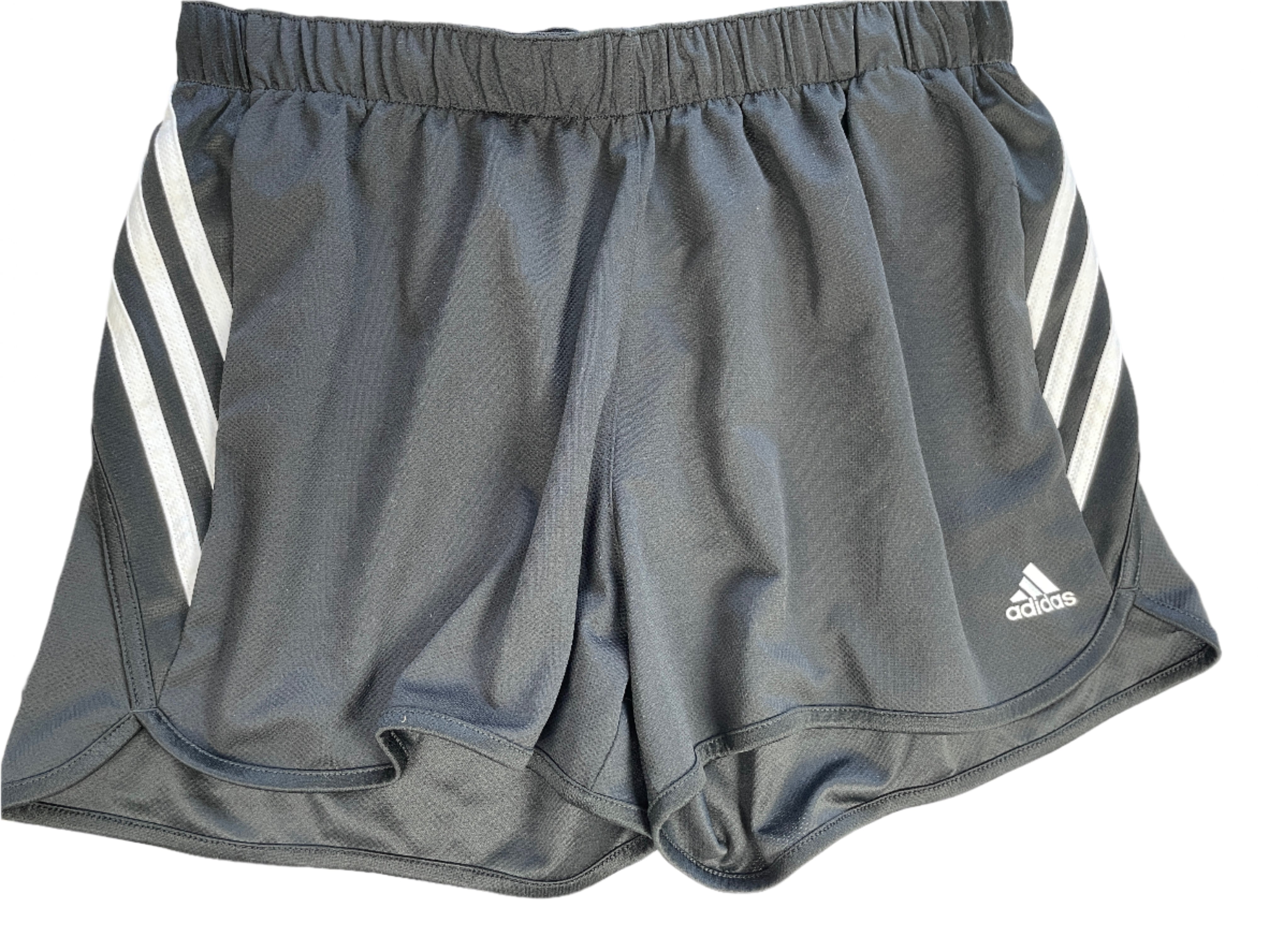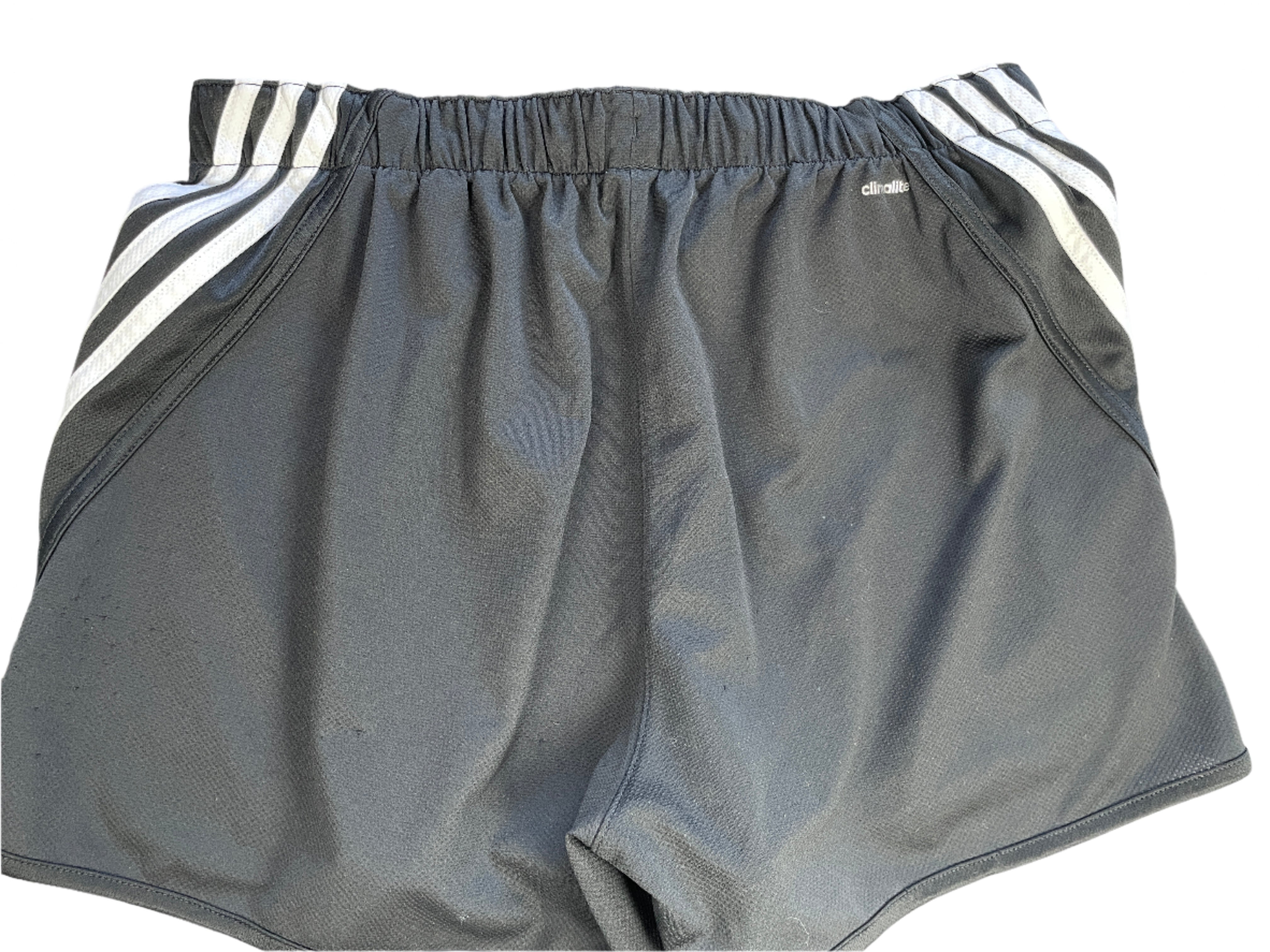 Stay cool and comfortable with these Adidas Climalite black athletic shorts! Featuring an elastic waistband with drawstring, these 100% polyester shorts are lightweight and breathable – perfect for workouts, running errands, or lounging in sporty style. Signature three-stripe design on both sides and subtle logo detail on the front add that iconic Adidas touch.