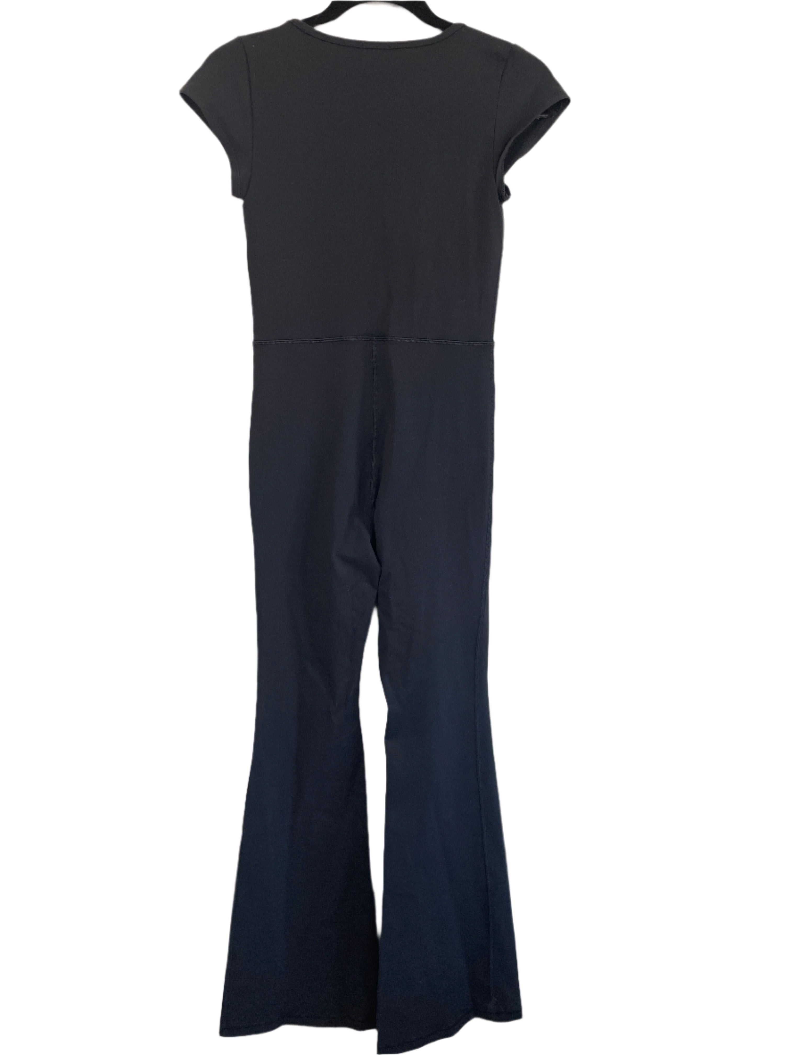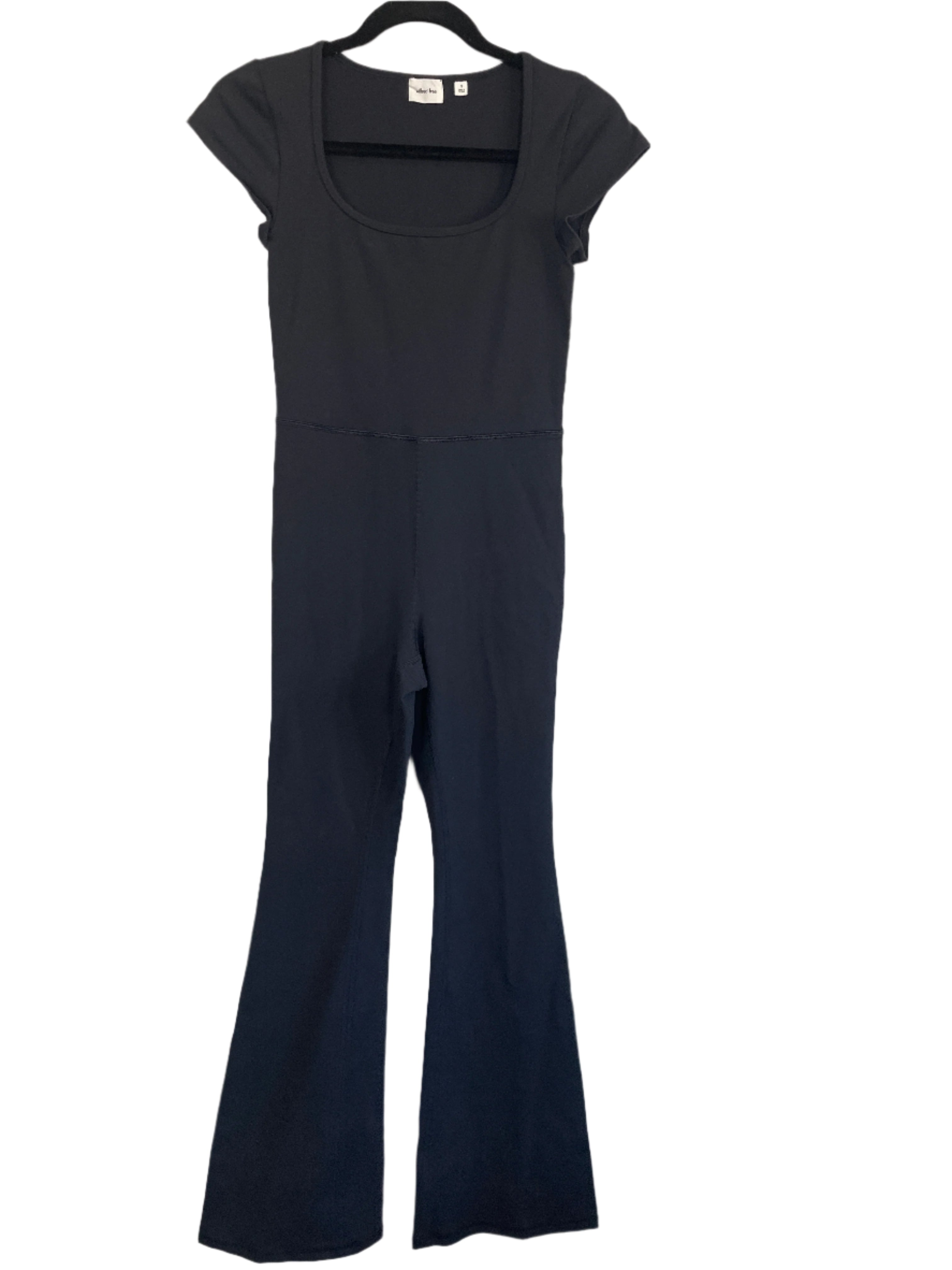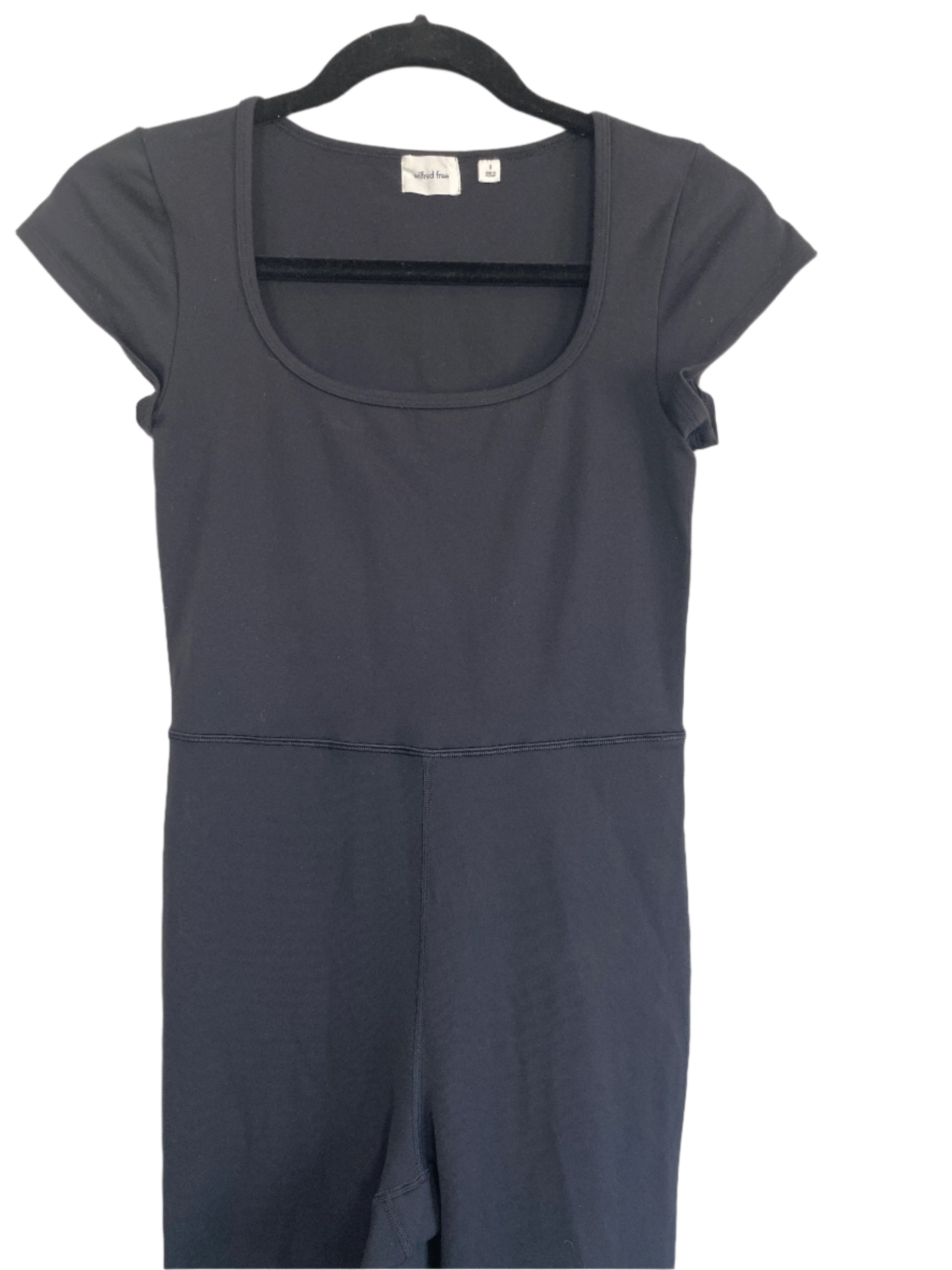 This sleek black jumpsuit by Wilfred Free (Aritzia) is a one-and-done outfit made for comfort and movement 💃 Featuring a flared leg, scoop neckline, and cap sleeves, it’s ultra-flattering with a body-hugging fit that stretches with you. While the garment tag is missing, a similar style on Aritzia’s website is made of a nylon/elastane blend that’s sweat-wicking, soft, and breathable 💦🖤