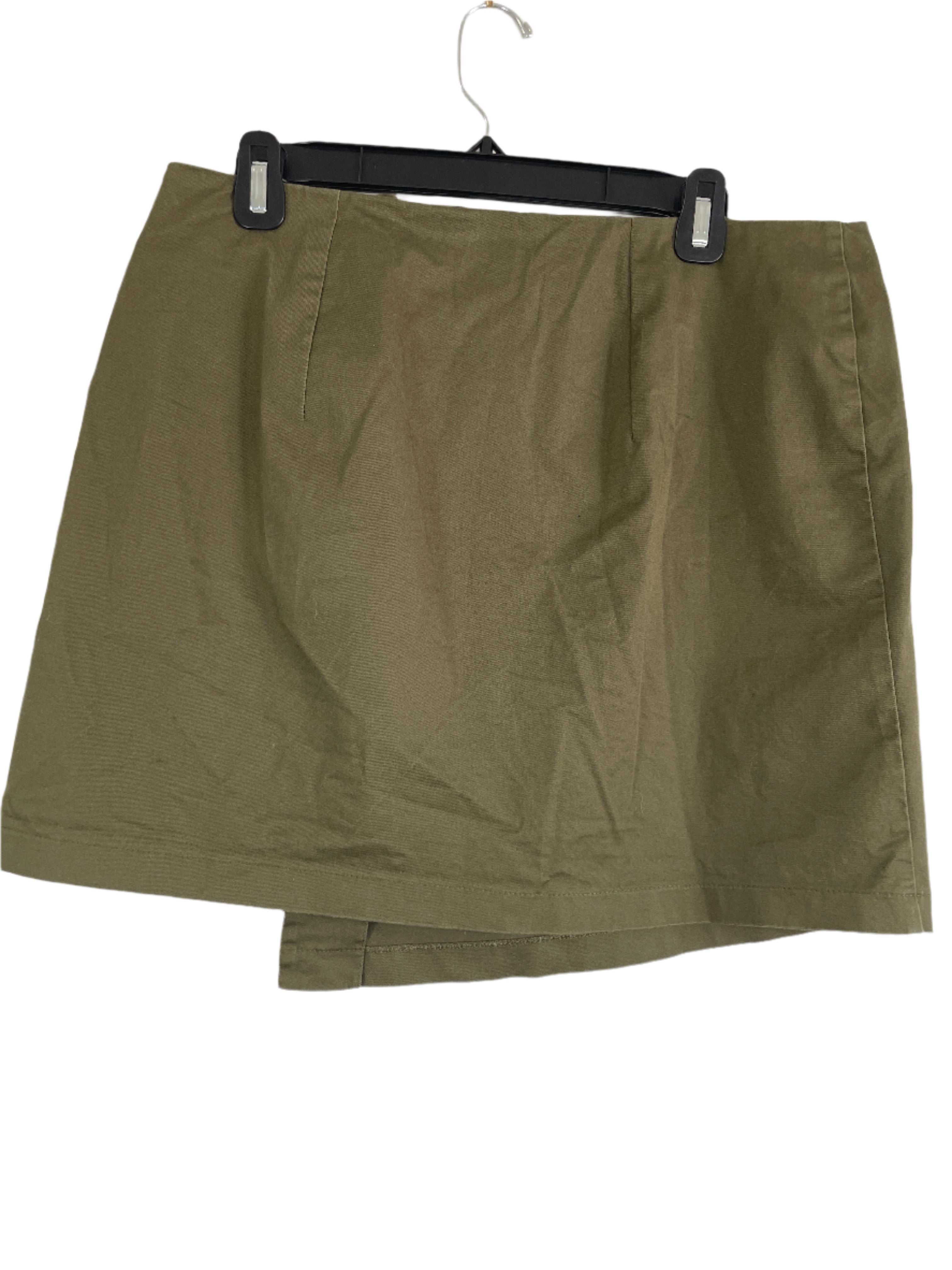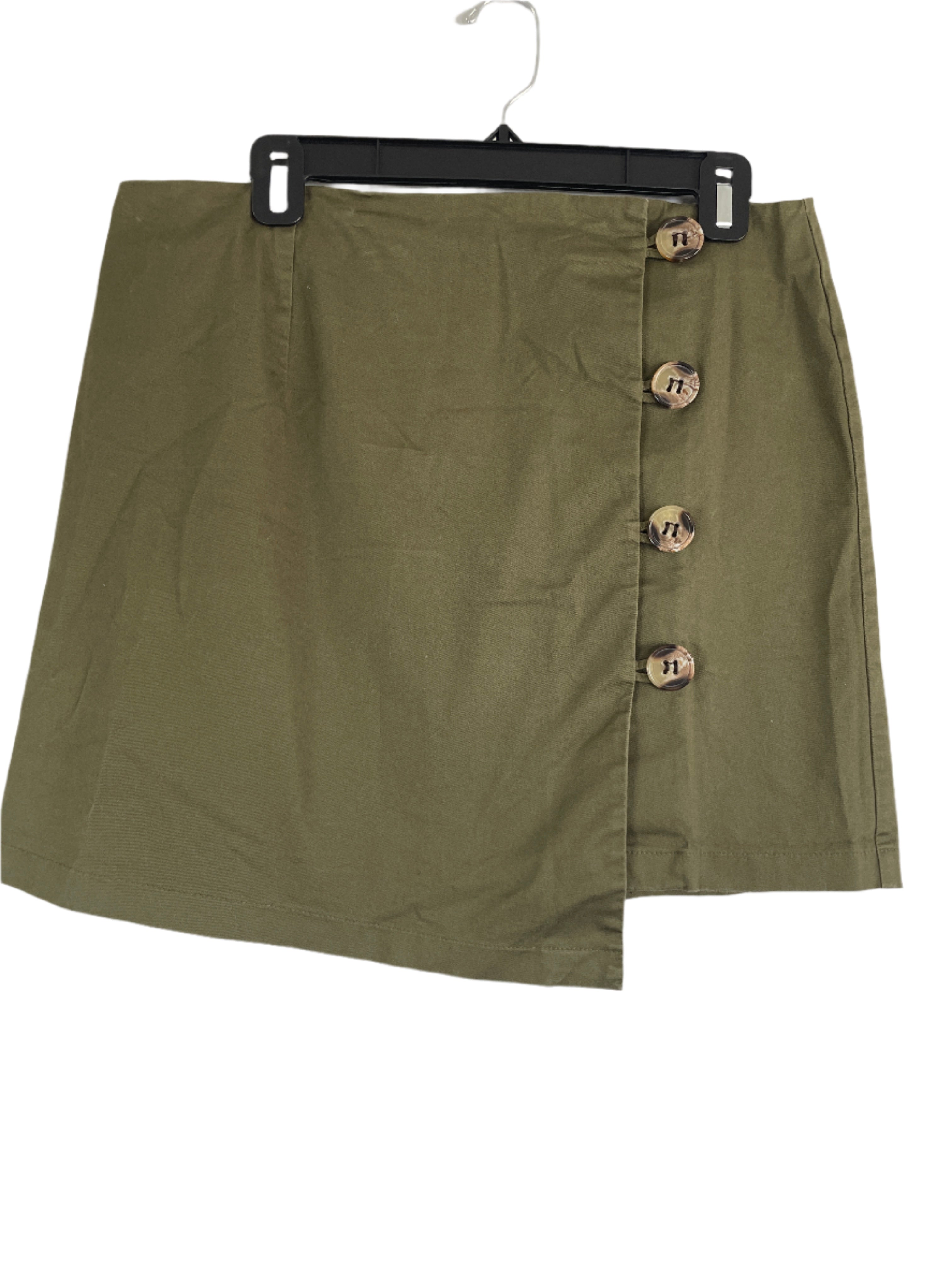 Fresh, fun, and flattering! This ASOS mini skirt in army green features an asymmetric front flap with large statement buttons. Made from a comfortable cotton blend, it's perfect for both casual looks and edgy pairings. In excellent condition and ready to be styled your way!