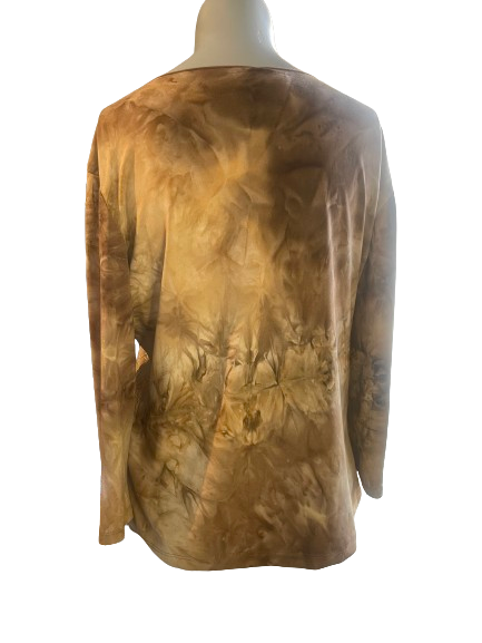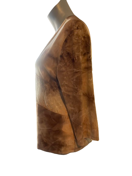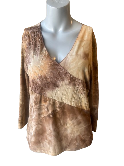 Elevate your wardrobe with this secondhand Dressbarn V-Neck Beige Brown Blouse! 🌺 This unique blouse features a stunning brown and beige tie dye design, accented with subtle sequins for a touch of glam. Perfect for any occasion, this blouse will make you stand out in style! ✨