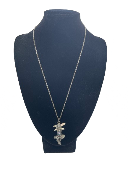Channel whimsical, fantasy vibes with this charming fairy pendant necklace. The detailed fairy figure features shimmering opaque wings and holds a dazzling faceted crystal-like orb. The pendant has a substantial weight and may be pewter, though it's unstamped and the metal type is unknown. The necklace includes a lobster clasp with extender for adjustable length.