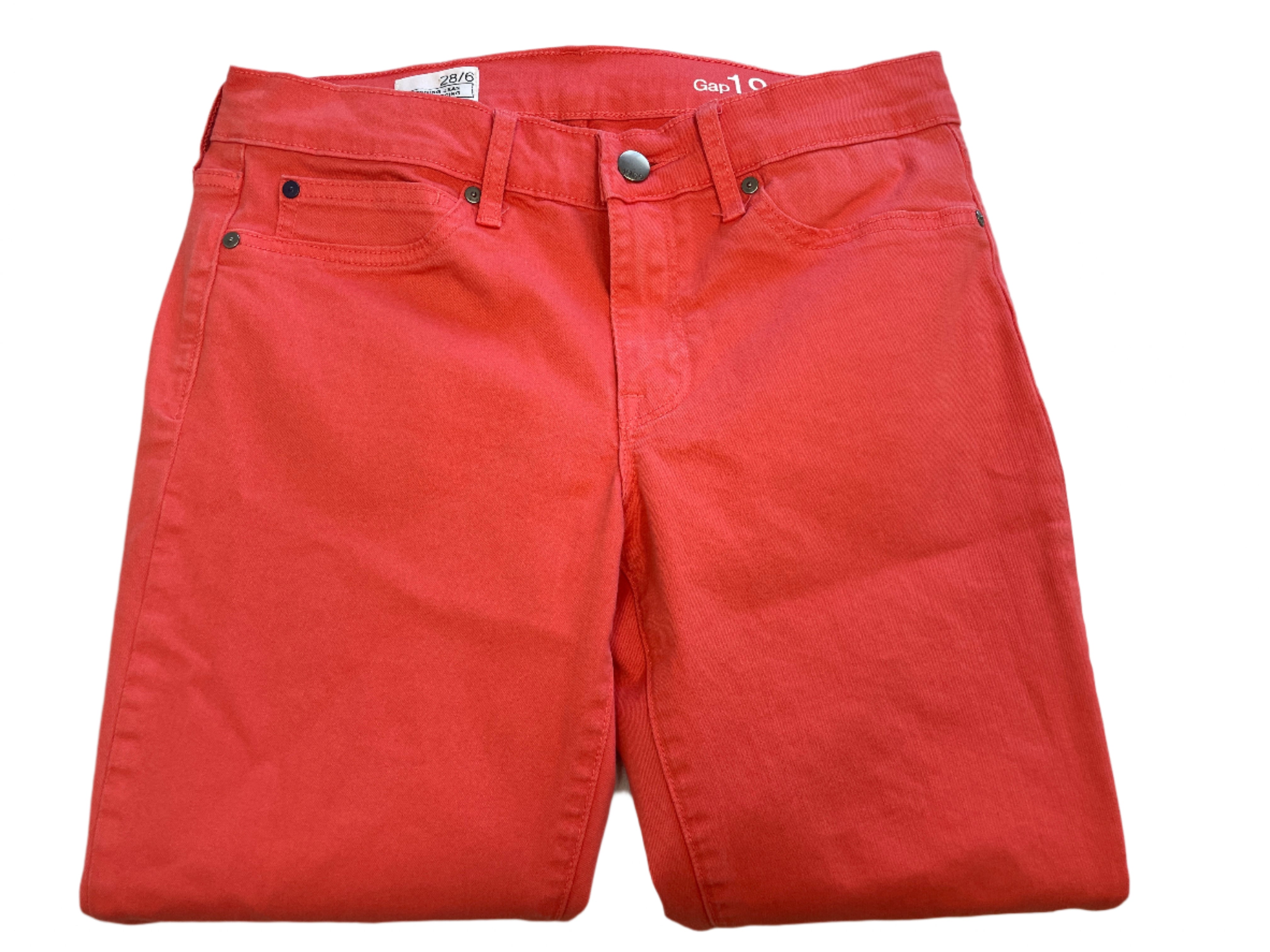 Add a bold pop of colour to your wardrobe with these GAP 1969 coral jeggings in a flattering size 28 (6). These pants offer the look of jeans with the comfort of leggings, featuring a zipper fly with button closure, mock front pockets, and two real back pockets.