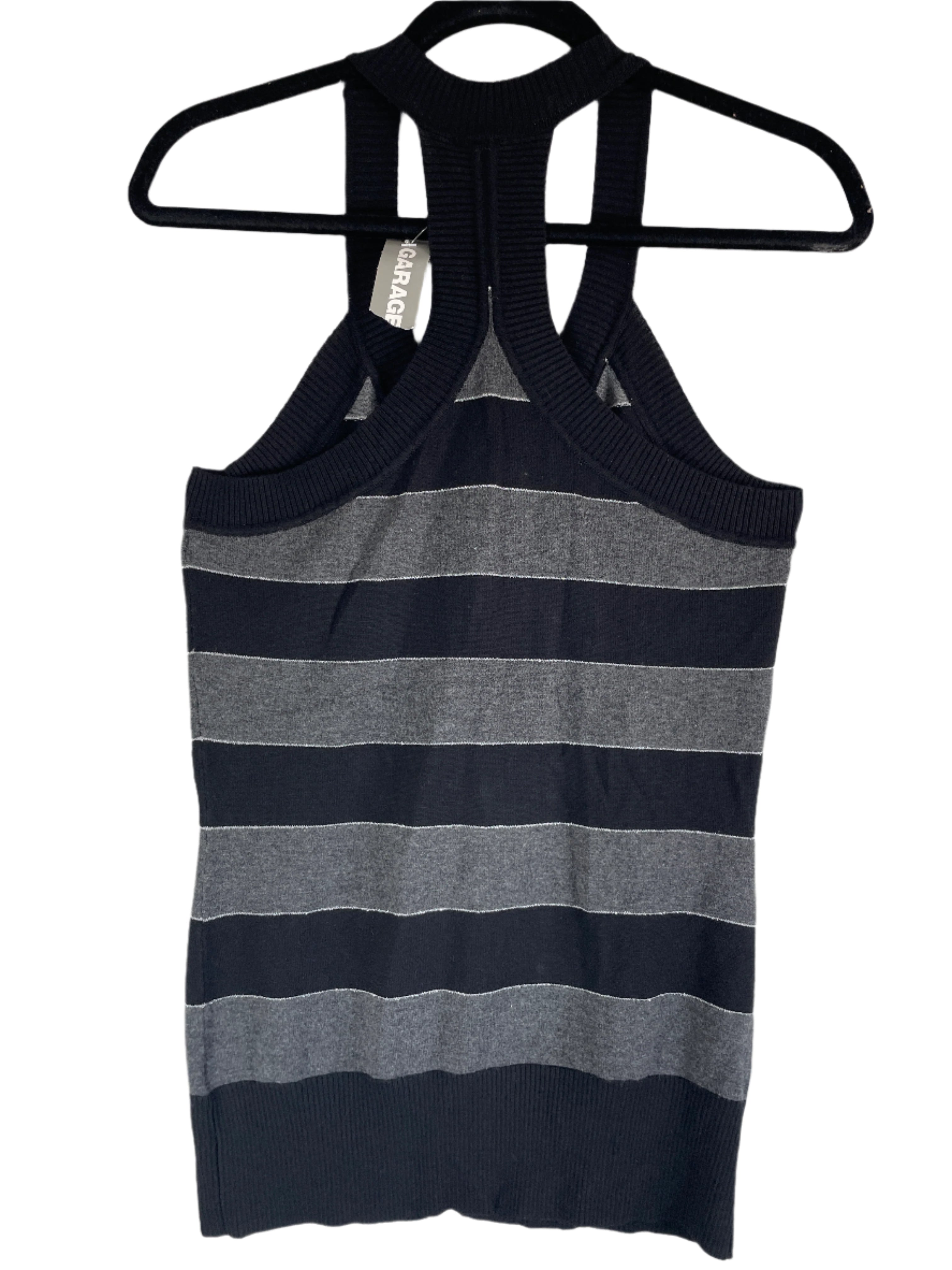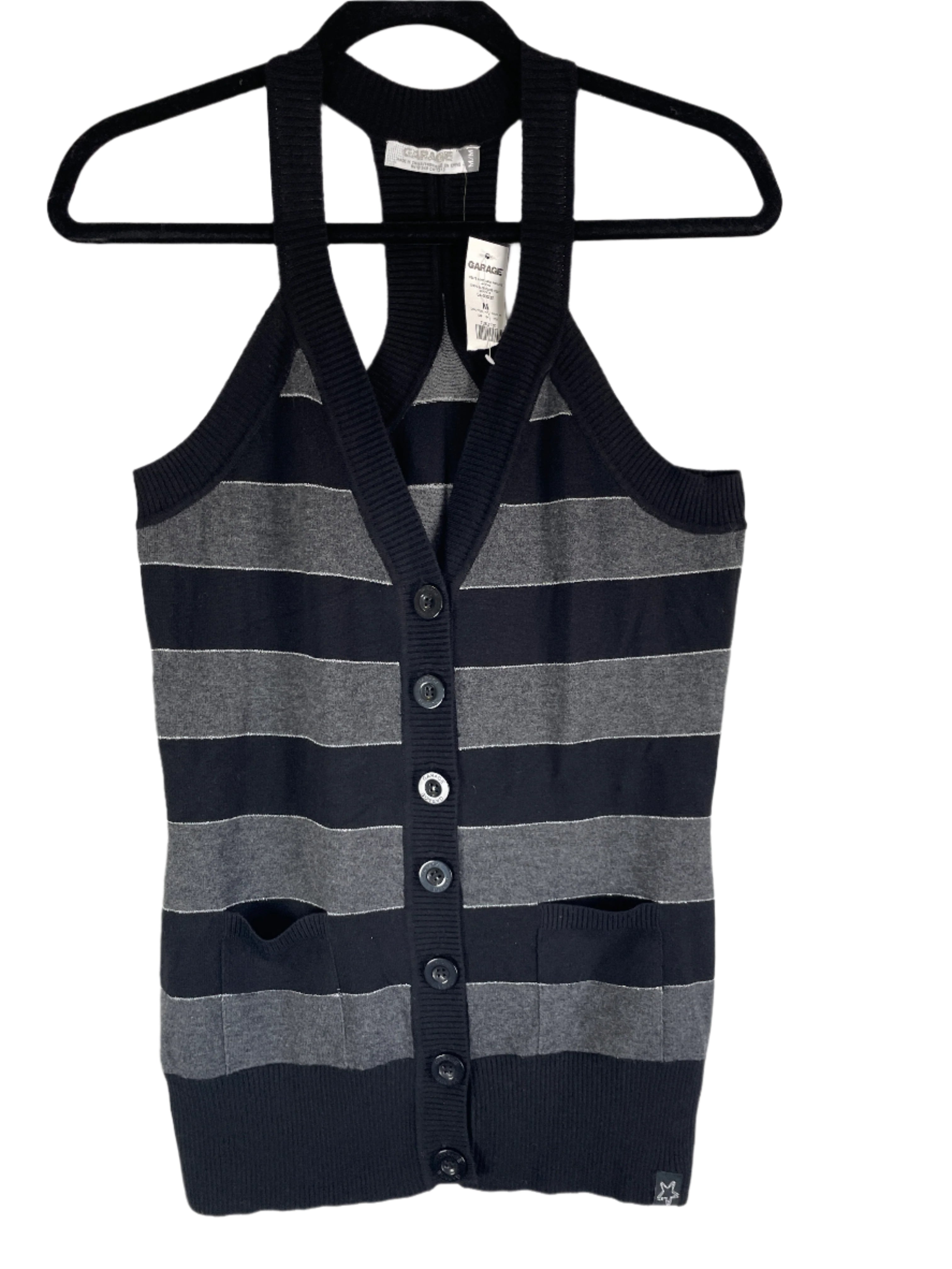 A unique twist on the classic sweater vest! This Garage piece features a bold halter neckline, button front closure, and striped black and grey knit. With two small front pockets and a soft, stretchy feel, it’s a fun and fitted look perfect for layering or wearing solo. New With Tags and in flawless condition.
