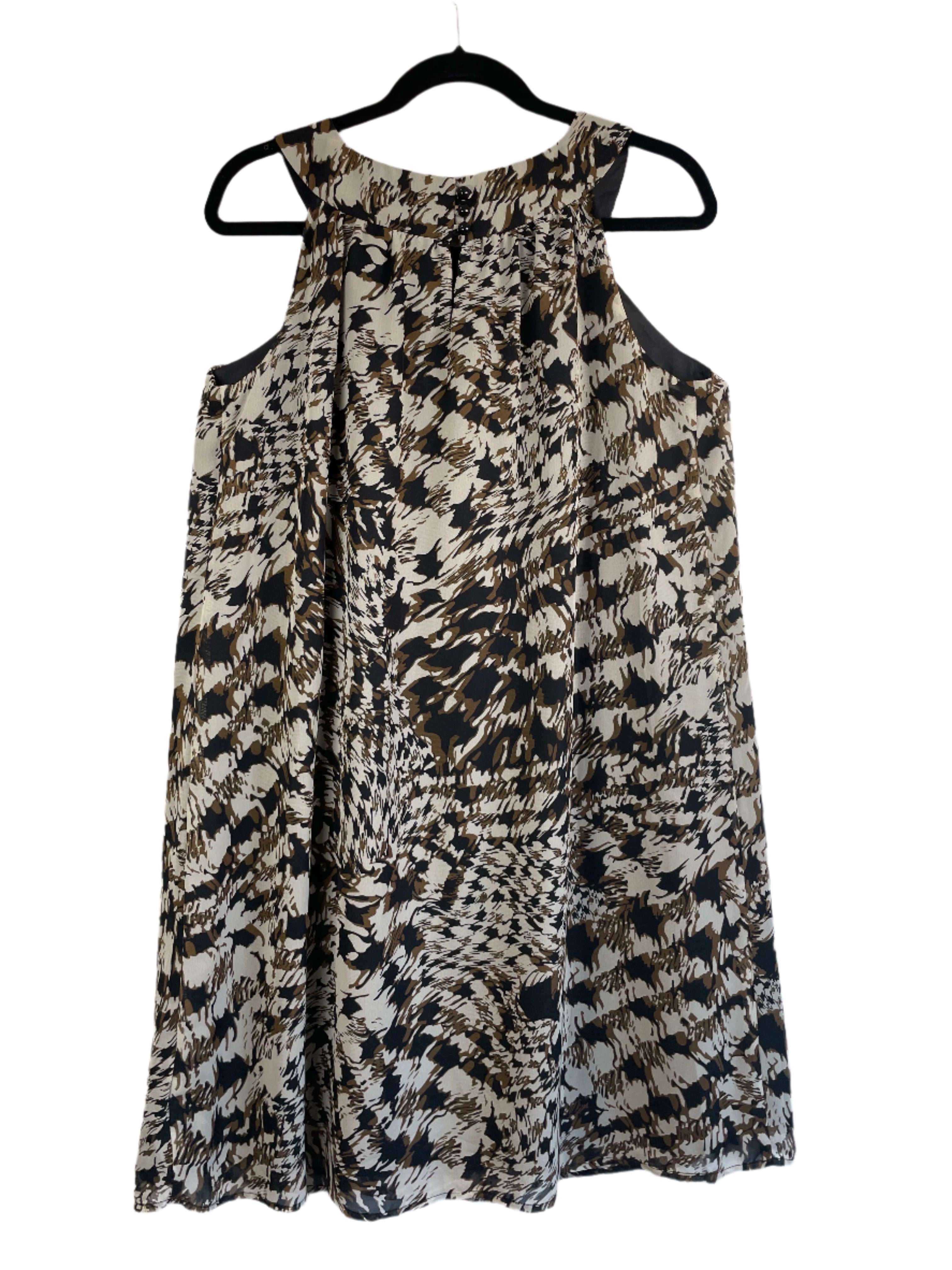 Turn heads in this eye-catching Jessica dress featuring a bold abstract print in rich black, brown, and cream tones. Designed with a flattering A-line silhouette, it offers elegant details like a sleeveless cut, three-button back closure, and full lining for a comfortable and polished fit. The lightweight 100% polyester fabric gives this dress lovely flow and movement. ✨