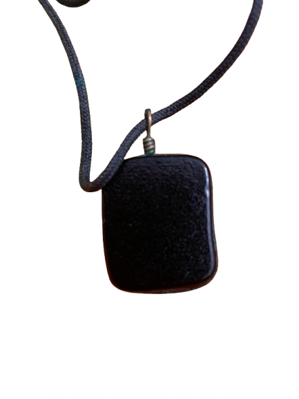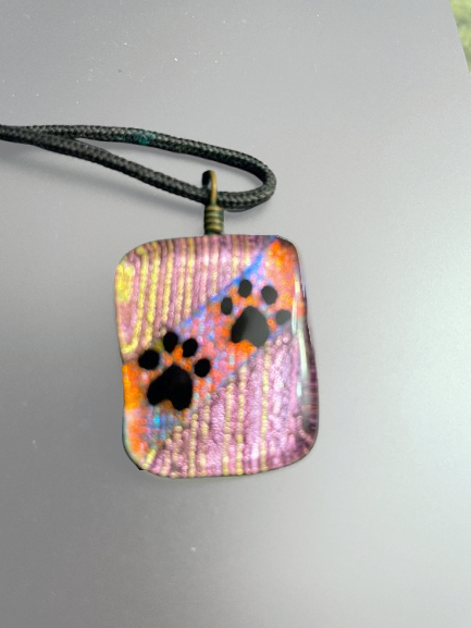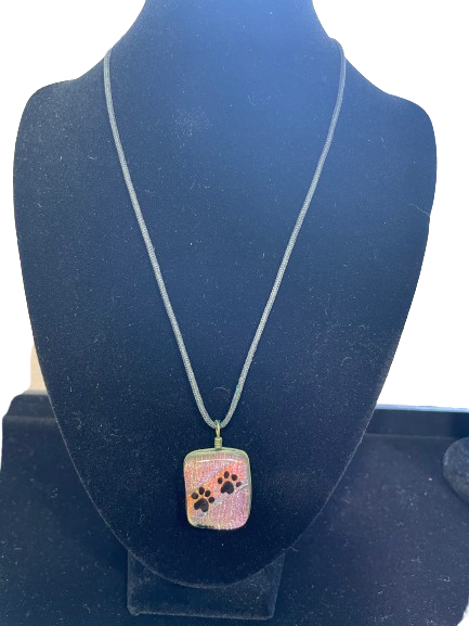 This unique paw print pendant necklace features a clear dichroic-style glass pendant with shimmering pink and orange tones and black paw prints embedded within. The rectangular pendant has a glossy finish and hangs from a simple rope-style chain that ties at the back of the neck, making it adjustable for comfort. A meaningful and stylish piece, it’s perfect for animal lovers or anyone wanting to keep a reminder of their furry friend close.