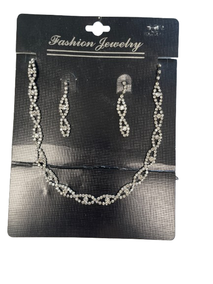 Add sparkle to any outfit with this rhinestone necklace and earrings set featuring an eye-catching twist pattern. Perfect for weddings, prom, or formal evenings. In excellent condition, ready to shine!