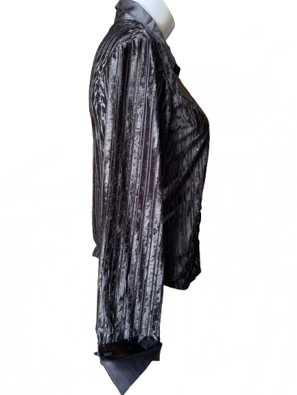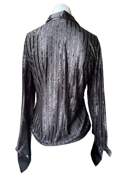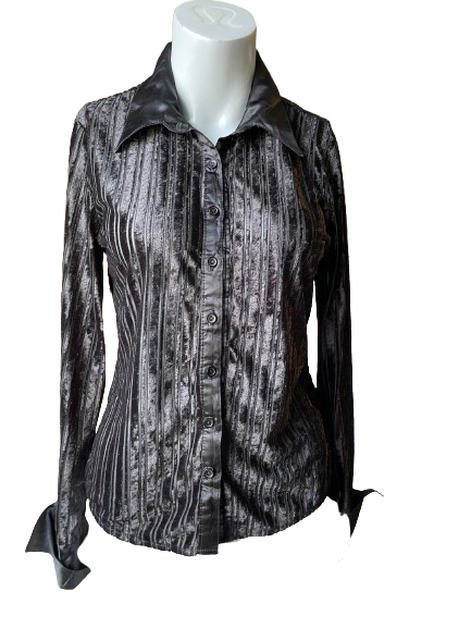 Indulge in luxury with this Suzy Shier Black Velvet Satin Blouse. Featuring elegant satin cuffs and collar, this blouse elevates your style with black sheer panels adorned with rich velvet. Perfect for a sophisticated and exclusive look. #š¤Ā
