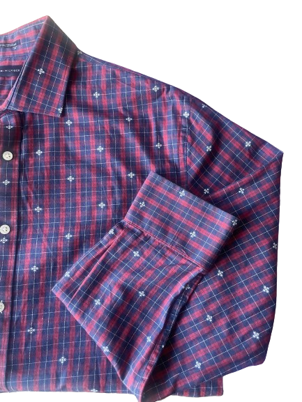 Upgrade your wardrobe with this secondhand Tommy Hilfiger Slim Fit Stretch Red Navy Check Shirt! The perfect thrifted deal, this shirt looks like new and is under $10. Look stylish without breaking the bank. 💰💪 #FashionForLess
