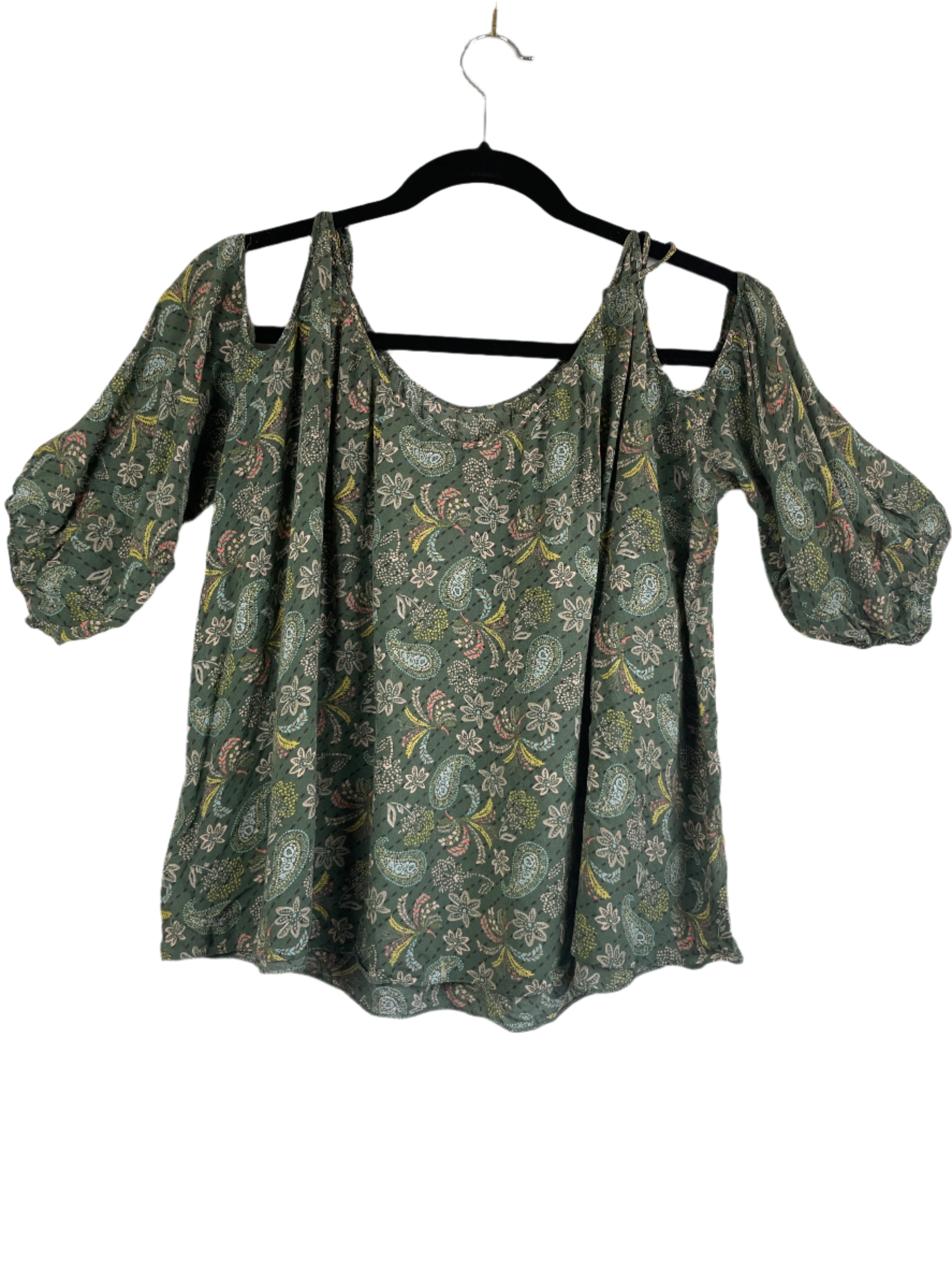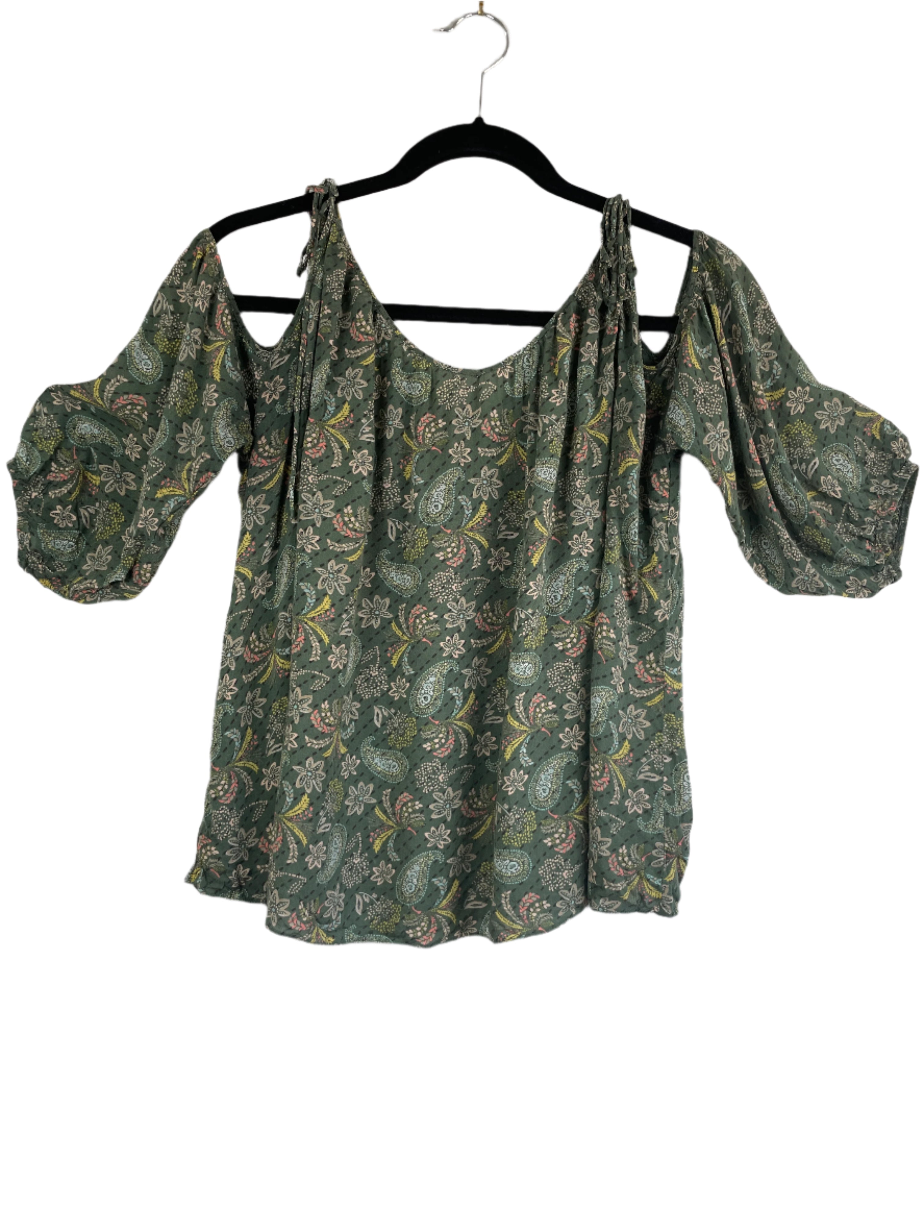 Breezy and beautiful, this Victoria's Secret off-shoulder blouse features a charming green paisley print, adjustable tie shoulders, and puffed sleeves with an elastic cuff. Made from lightweight 100% viscose, it's soft, flowy, and perfect for warmer days ☀️