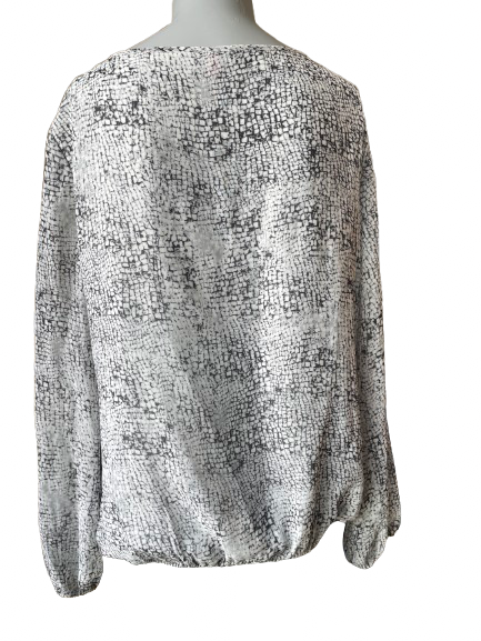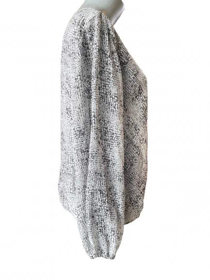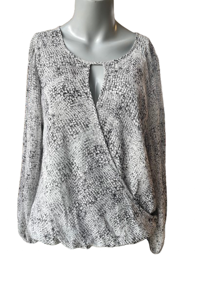Add a touch of luxury to your wardrobe with the Vince Camuto Grey White Overlap Blouse. Made by a quality brand, this elegant blouse exudes sophistication and exclusivity. With its unique overlap design, it's the perfect addition to any fashion-forward outfit. Upgrade your style with Vince Camuto.