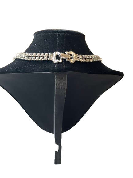 Add a touch of vintage Hollywood glamour to your outfit with this stunning rhinestone bib necklace. This eye-catching piece features two rows of shimmering rhinestones with dangling teardrop and round-cut accents that catch the light beautifully. Perfect for special occasions, parties, or bridal wear
