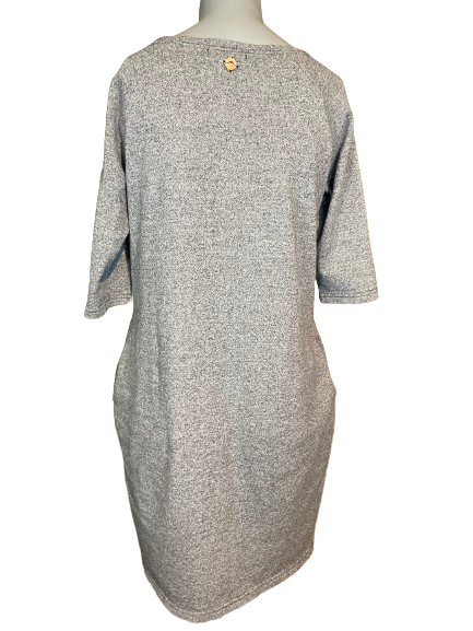 A grey sweatshirt dress with side pockets, displayed on a mannequin.