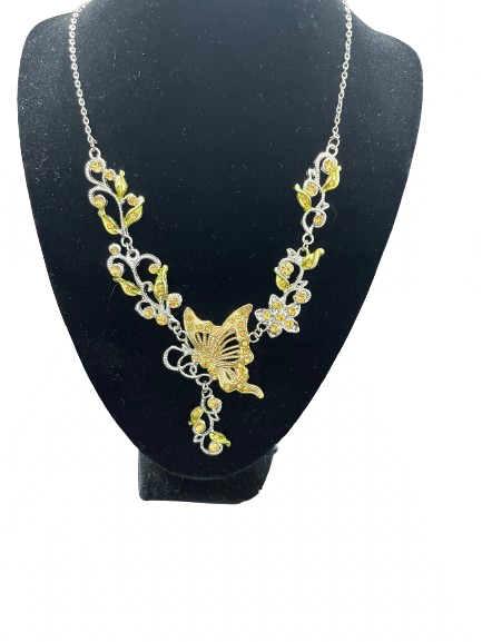 A charming duo of butterfly-themed necklaces featuring two distinct designs — one delicate and floral, the other bold and vintage-inspired. The first necklace showcases a gold butterfly perched among silver and yellow enamel leaves, accented with small clear crystals for subtle sparkle. The second features a large gold-tone butterfly pendant with white enamel wings and antique-style cutout detailing on a classic chain. Together, these pieces add a touch of whimsical elegance to any outfit.