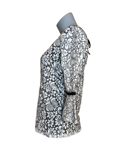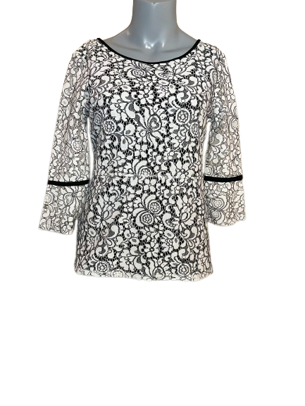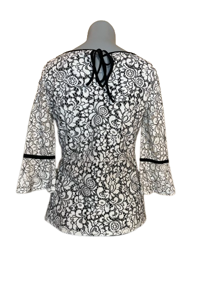 Make a sophisticated statement in the Adrianna Papell Black White Crocheted Lace Top. Crafted from a delightful combination of crocheted lace and bell sleeves, this timeless piece adds a touch of elegance to your wardrobe. Make sure to add this classic to your collection for a timeless look.