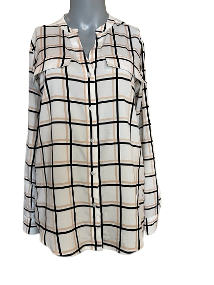 Lighten up your work wardrobe with our Calvin Klein Cream Grid Button Down Long Sleeve Blouse. This elegant blouse features a cream grid  pattern for a contemporary touch—perfect for taking you from the boardroom to happy hour in style!  Enhance your sophisticated look by pairing this timeless piece with your favorite skirt or trousers. #ThriftShopping for timeless pieces has never been so effortless!