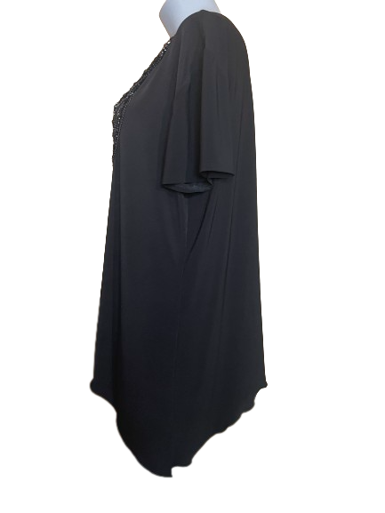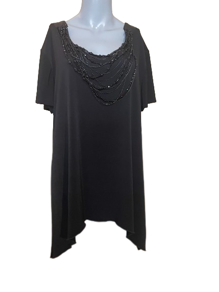 This captivating black blouse by Claudia Richard features a beaded necklace that's sure to leave an impression, and a unique shark bite hem for a touch of sophistication. Classy yet edgy, this piece exudes luxury and modern style.