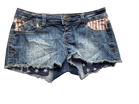 Rock the stars and stripes 🇺🇸 with these distressed denim shorts! Perfect for a boho look, these shorts feature an American flag design and frayed edges. Show off your patriotic side with 1st Kiss Denim Shorts! (USA! USA!) 🎆