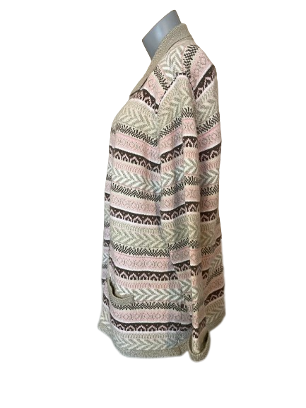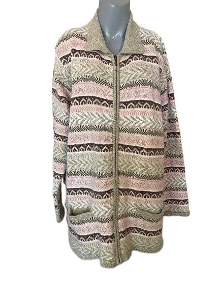 Stay warm in style with this Allison Daley Pink Brown Zip-Up Cardigan! This eye-catching cardigan features a stunning pink and brown aztec print that will brighten up any chilly day. With a cozy acrylic fabric and a full zip-up front, you'll be ready for whatever the cold weather brings. 🔥