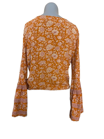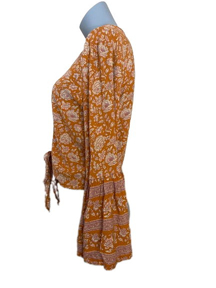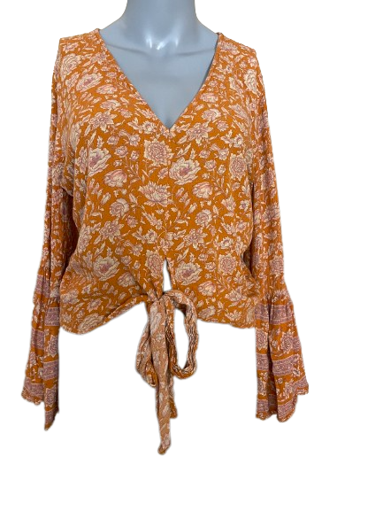 This American Eagle Orange Floral Boho Front Tie Top brings a sunny burst of color and style to your wardrobe! Thanks to its boho vibe and large bell sleeves, you'll be looking on trend in no time 🌼😎 #bohostyle