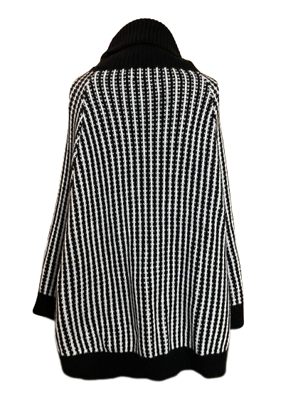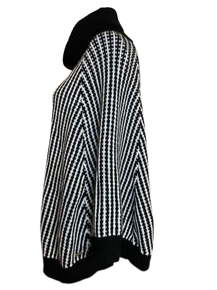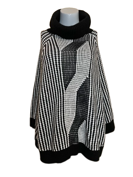 Experience the distinctive elegance and warmth of the Calvin Klein Black and White Sweater Poncho. This sophisticated piece features a turtle neck and is designed to keep you cozy during the coldest of days. An elegant statement piece, this poncho is sure to turn heads.