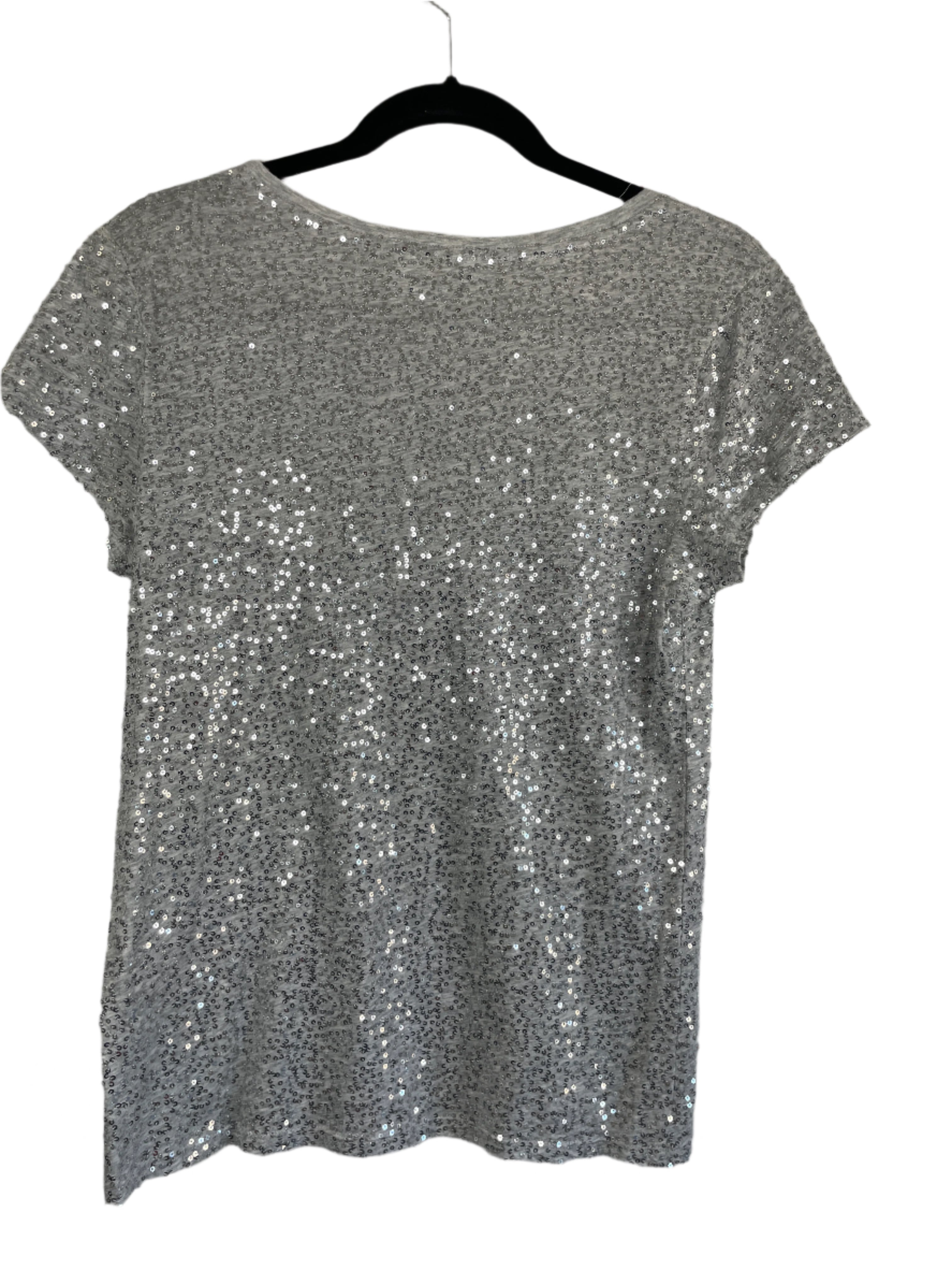 Add a little sparkle to your everyday wardrobe with this Calvin Klein sequin t-shirt in a soft heather grey. Featuring allover sequins on both the front and back, this short sleeve tee blends casual comfort with a touch of glam. Gently used and in excellent condition, it’s perfect for layering under a blazer or pairing with jeans for a night out.
