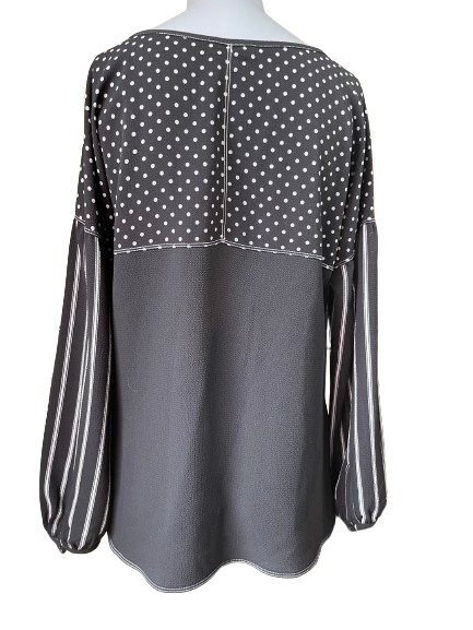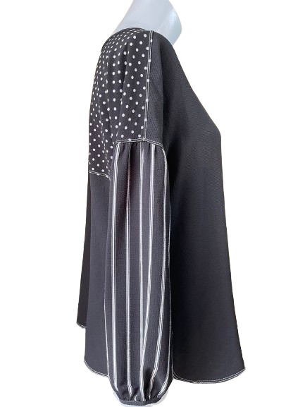 Unleash your inner fashionista with the Chenault Black Stripes Polka Dot Blouse! This unique blouse features striped arms that add a touch of sophistication, while the polka dots across the back bring a playful and whimsical vibe. The flowy fit adds comfort and allows for versatile styling options. 😉