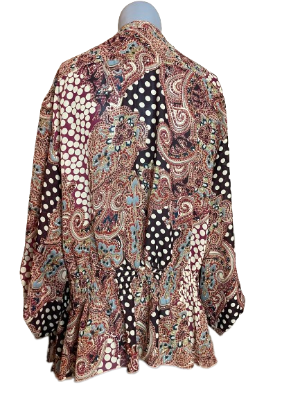 This Design Loft open blouse is like a boho dream! A flawlessly flowing fabric is expertly patterned in a dreamy dance of paisley, swirls, and polka-dots - adorning you in an effortlessly stylish way! It's the perfect pick for any fashionista looking for some serious style cred. 🤩