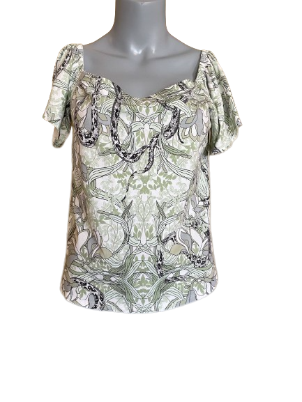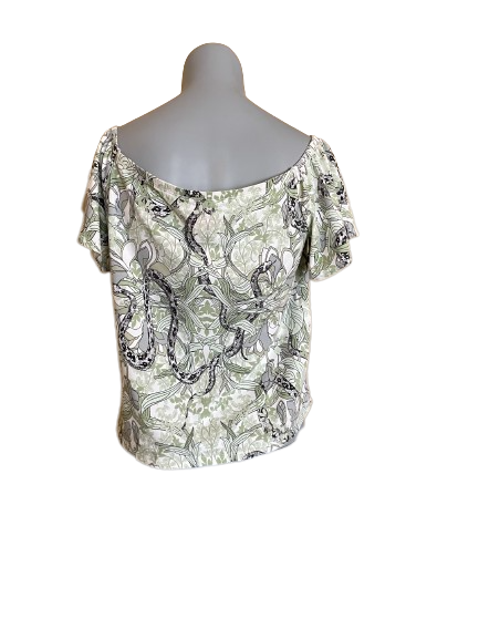 Discover your adventurous side in this GUESS Green Off-The-Shoulder top, featuring a daring snakes-in-grass print ready to take on the summer. Step up your off-the-shoulder game and turn heads with this fearless fashion statement. Be bold and make a statement.