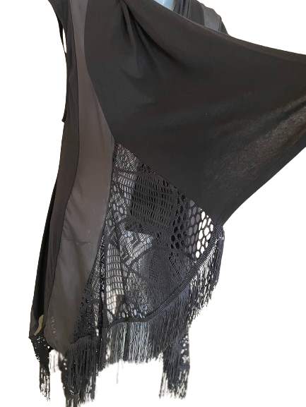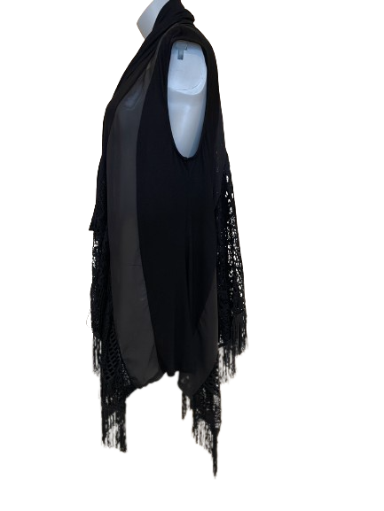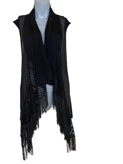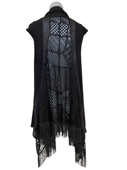 Luxuriate in the Haani Black Lace Fringe Vest. Rich black lace is trimmed with sheer panels and a fringe hem, elevating any outfit with sophistication and elegance. A must-have for any fashion-forward wardrobe.