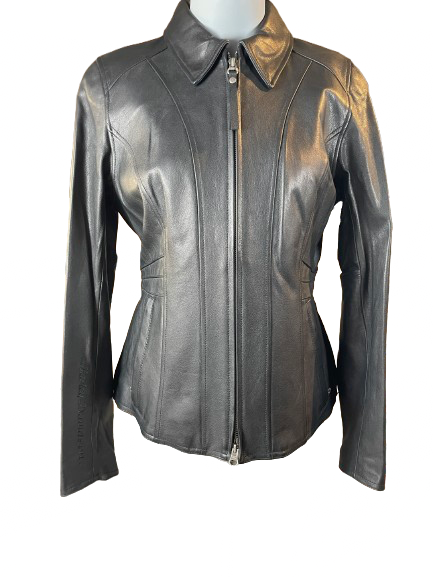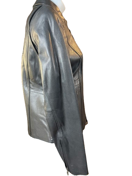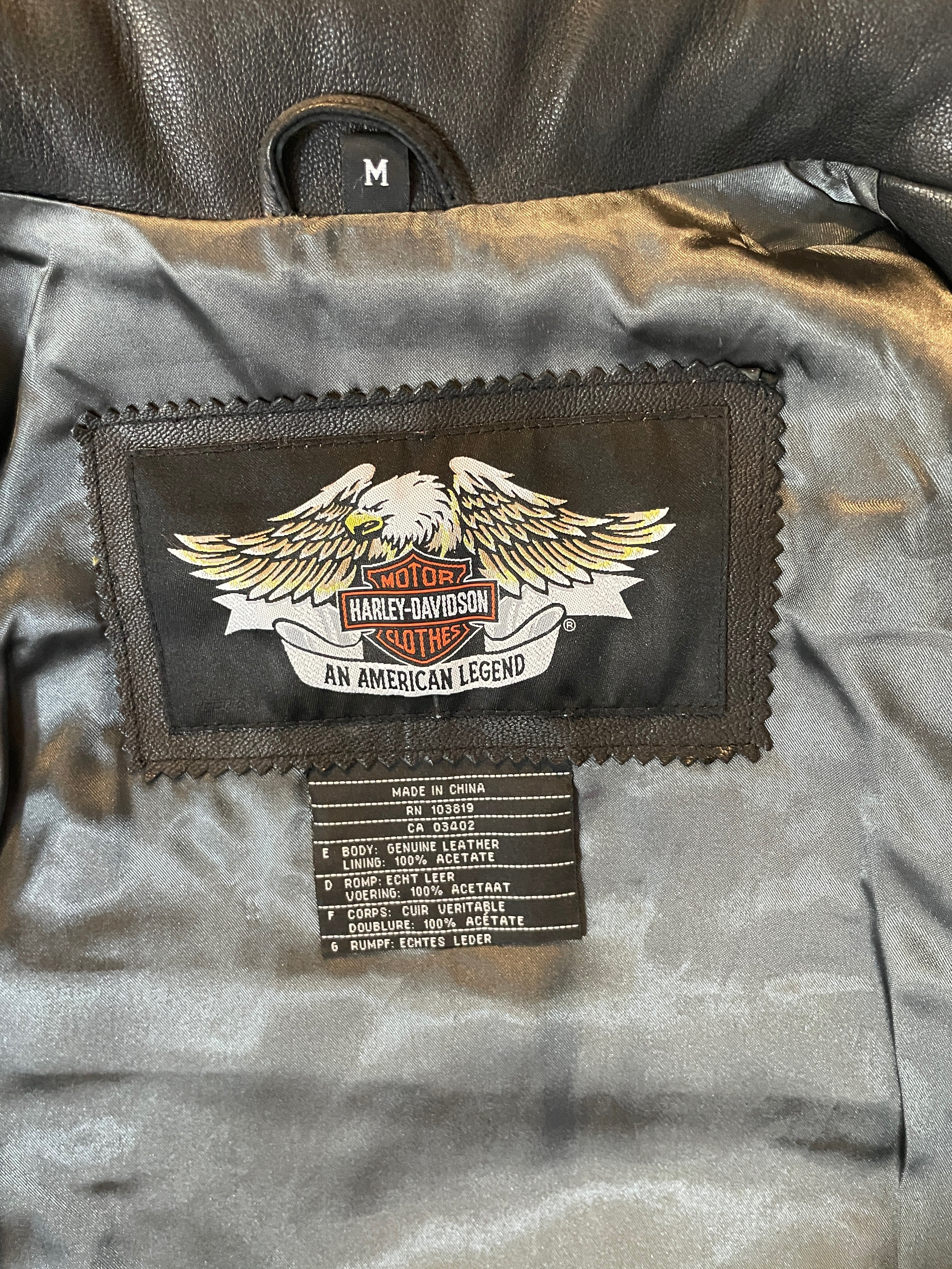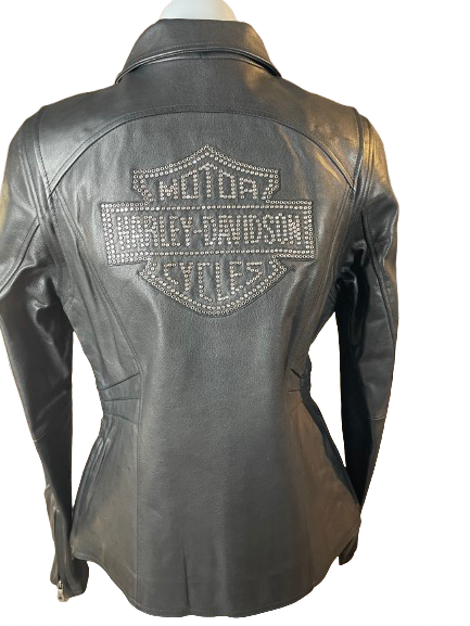 Ride in style with this one-of-a-kind Harley Davidson Black Leather Rhinestone Studded Jacket! In like-new condition, this rare find from the iconic brand will make you stand out on the road. Take a risk, make a statement, and add some edge to your wardrobe with this bold piece.