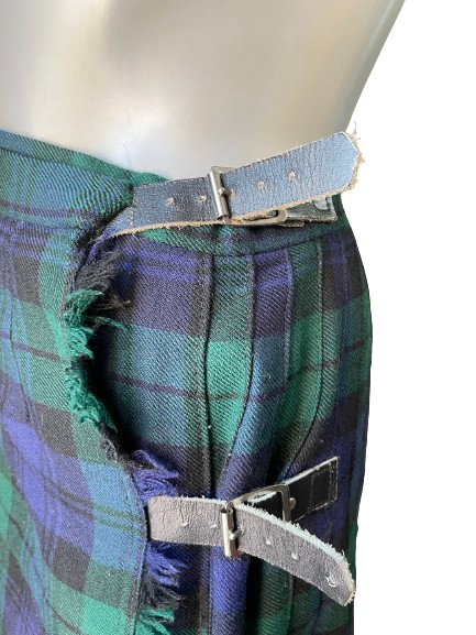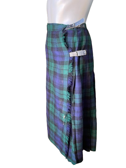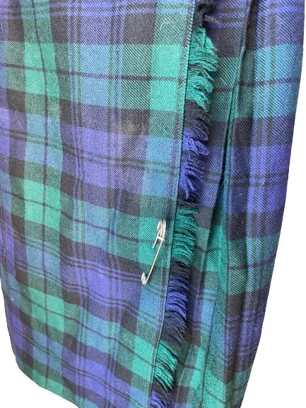 "Unleash your inner highlander with this rare Long Green Black Blue Kilt! Perfect for adding some edge to your wardrobe and standing out in a crowd. Don't miss out on this unique find! 🔥"