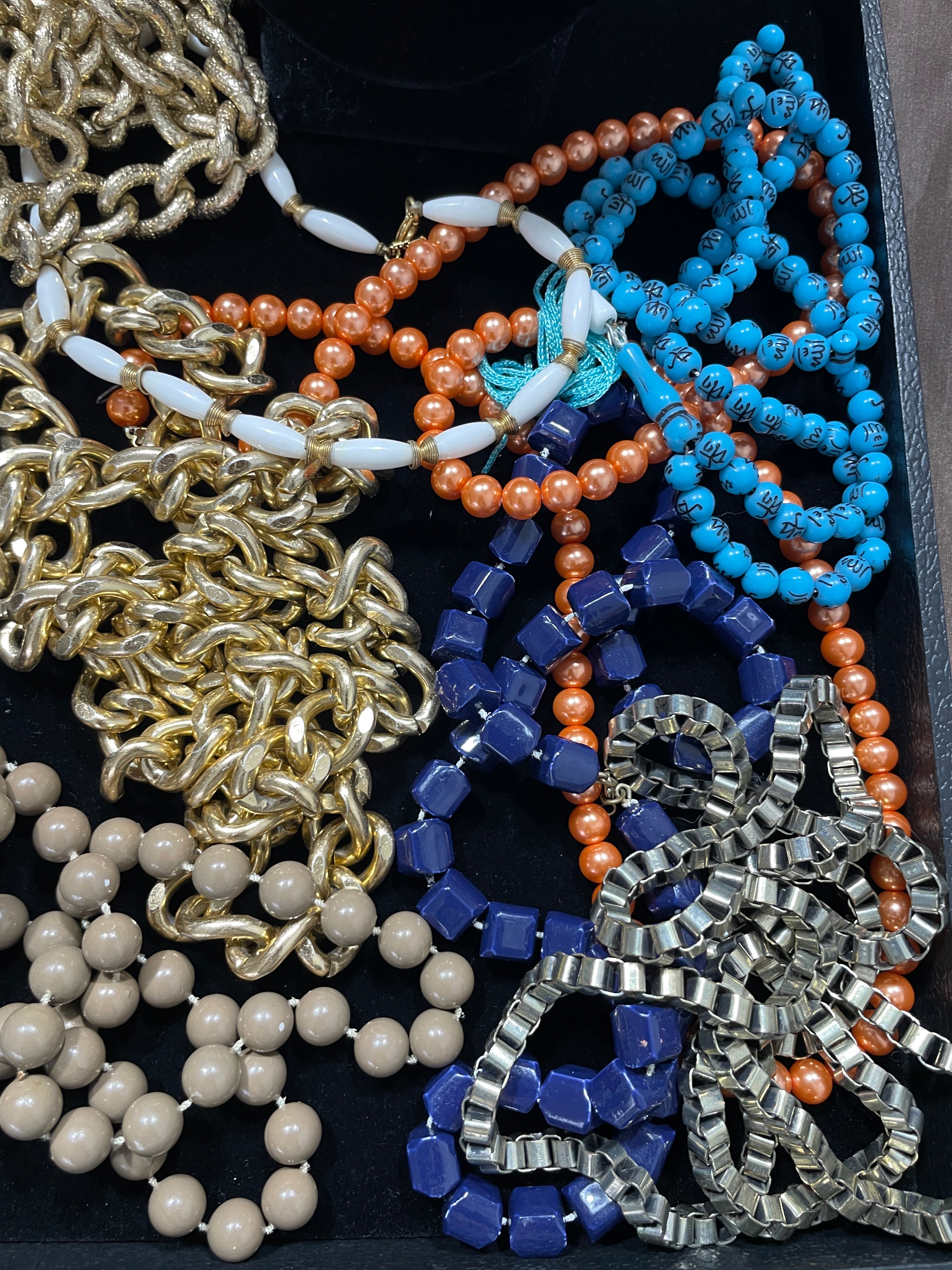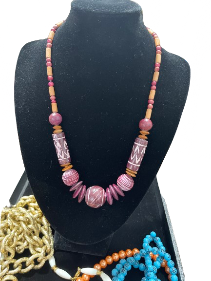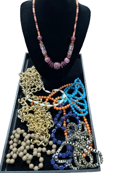 A curated collection of nine bold costume necklaces ranging from retro-inspired to modern statement pieces. This assorted lot includes chunky chains, beaded strands, and handcrafted designs in a vibrant mix of gold, coral, turquoise, navy, and neutral tones. Perfect for collectors, stylists, or anyone looking to add personality and variety to their jewellery wardrobe. Several pieces show vintage construction details typical of the 1970s–1980s, while others appear more contemporary.