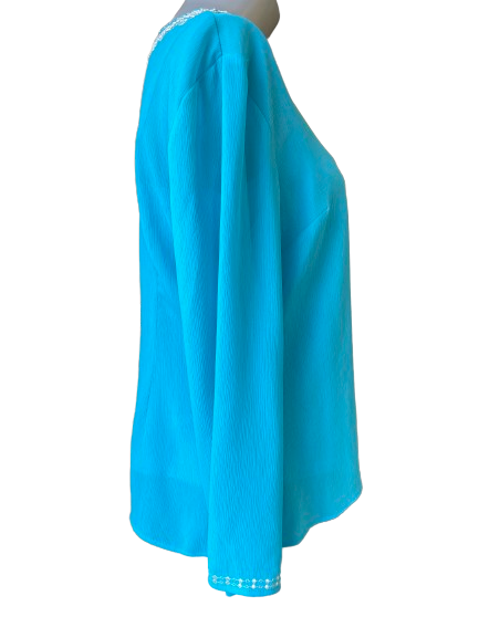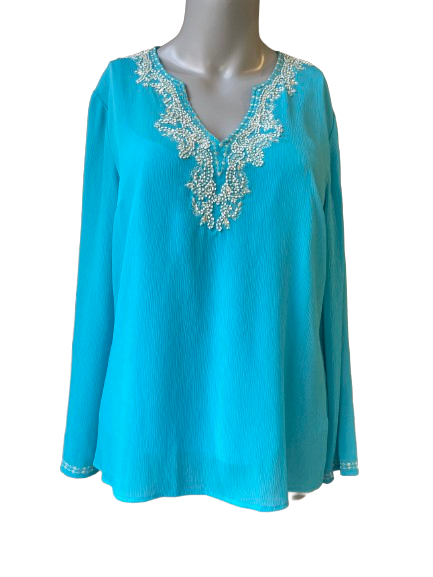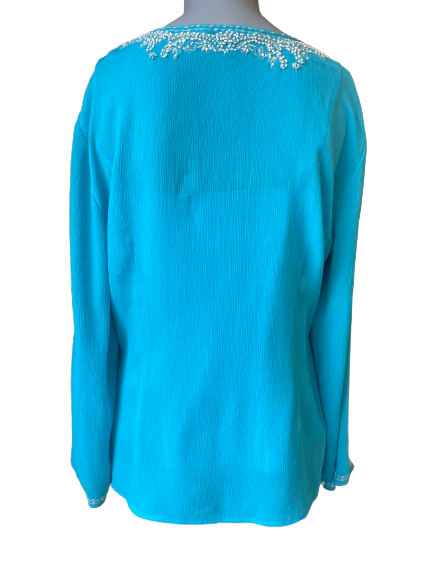 Elevate your wardrobe with this Peter Nygard Blue Petites Camisole Blouse. This beautiful blouse features intricate beadwork and a built-in camisole, making it the perfect blend of style and convenience. Add a touch of luxury to any outfit with this exclusive piece.