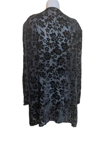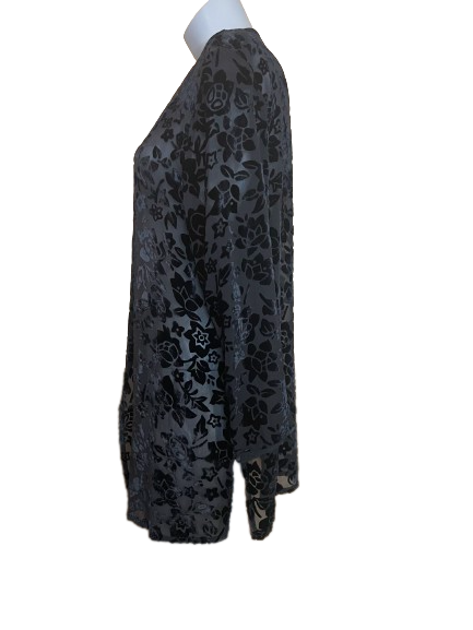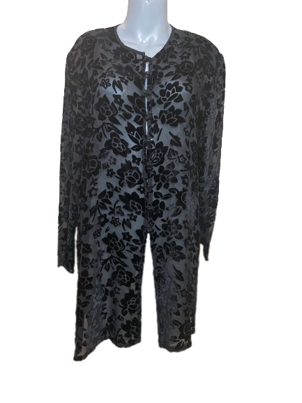 Look effortlessly chic in this R&M Richards Black Sheer Blouse. Crafted from delicate, sheer material, this special piece features beautiful decorative buttons that will turn heads. Perfect for any special occasion!