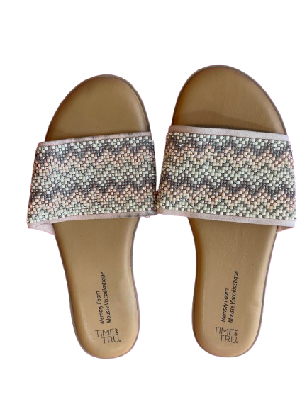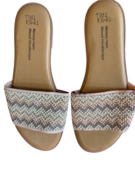 Step into comfort and style with Time And Tru Memory Foam Rhinestone Sandals! These gorgeous slip on sandals feature soft memory foam for all-day comfort and stunning rhinestone detailing in pink and beige. Perfect for adding a touch of sparkle to any outfit! ✨