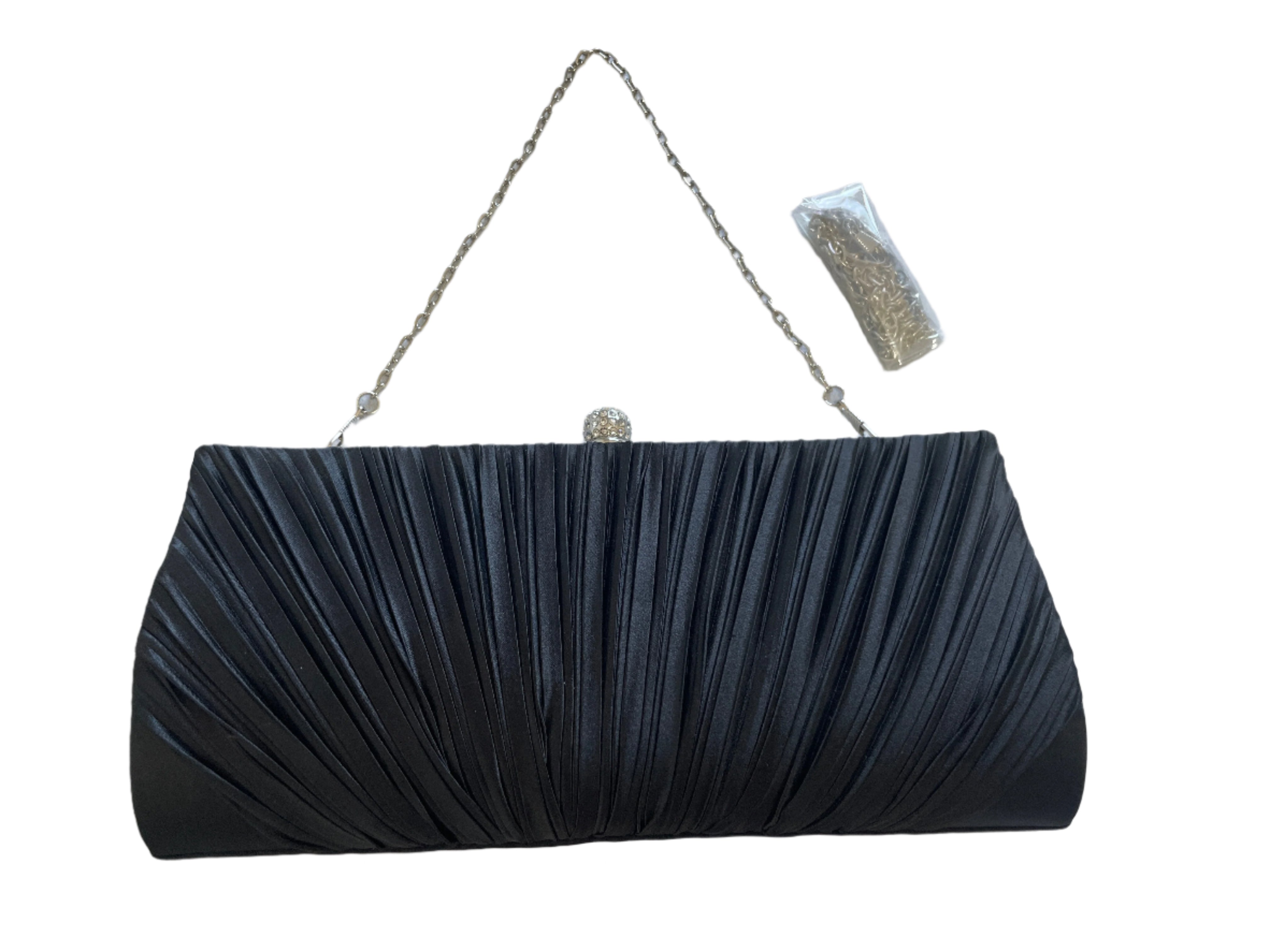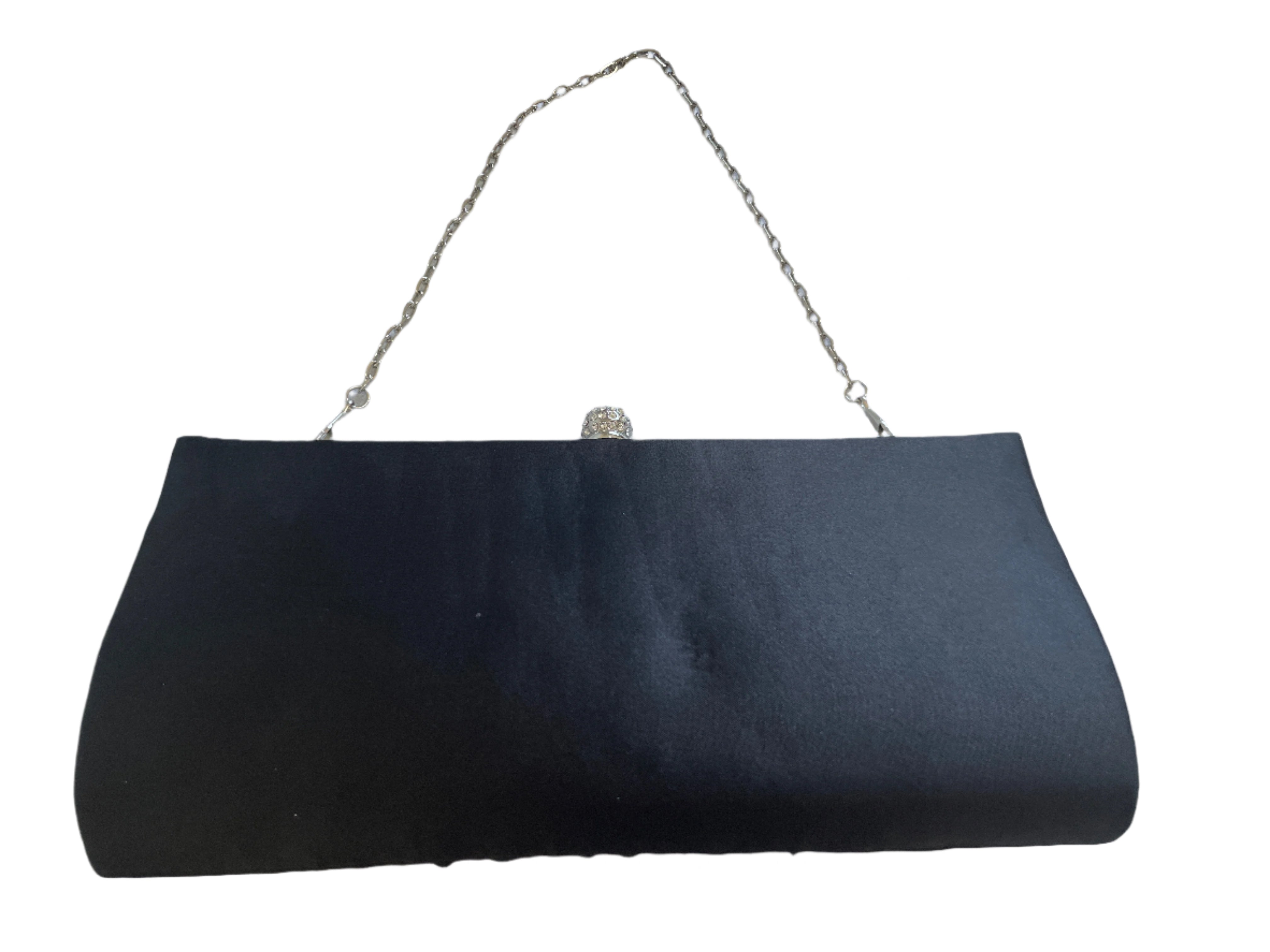 ✨ Elegant and timeless, this vintage black satin evening bag is the perfect accessory for special occasions. The front features gorgeous pleated satin detailing while the back remains sleek and smooth. A sparkling rhinestone ball claspadds a touch of glam 💎.
