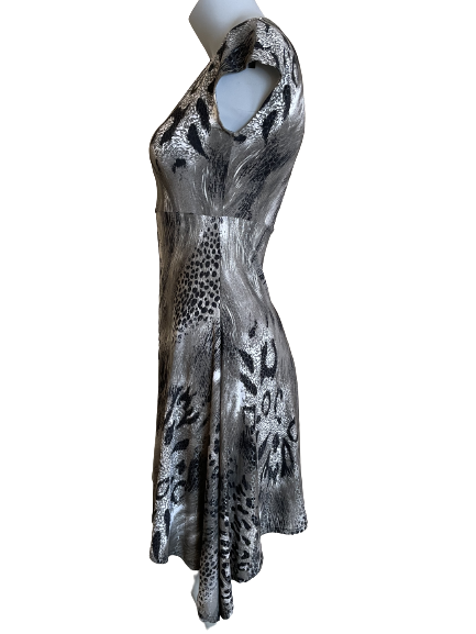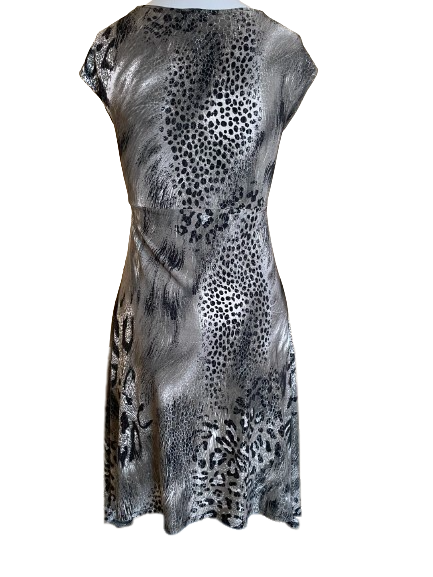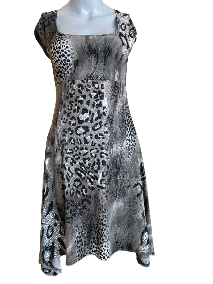 Genessa Designs presents this unique black and grey animal print dress, perfect for any occasion. Its asymmetrical hem provides a dramatic, flowing silhouette that adds an elegant touch to any ensemble. Its eye-catching design will ensure you stand out from the crowd.
