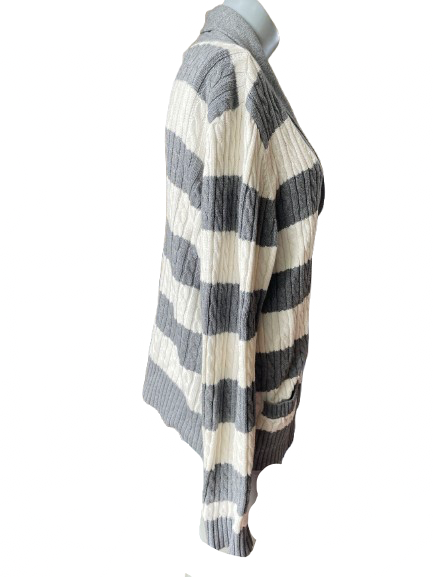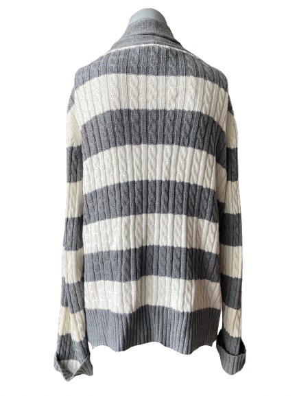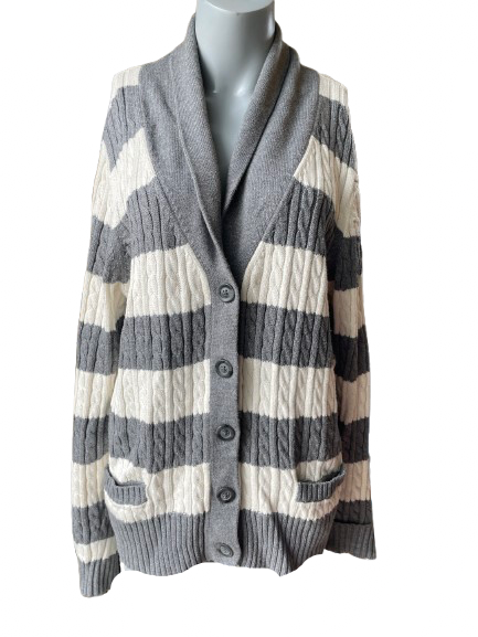 Elevate your style with the Tommy Hilfiger Grey White Striped Cardigan! This thick cable knit cardigan boasts both comfort and quality in one stylish package. Perfect for both casual and formal occasions, this cardigan from a renowned brand is an essential addition to your wardrobe. ⚡️🔥