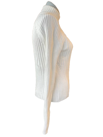 Experience luxury and style with this Tommy Hilfiger White Zip-Up Ribbed Cardigan! This beautiful piece boasts a mock neck for added sophistication and a hugging fit for a flattering silhouette. Perfect for any occasion, add this cardigan to your wardrobe for a touch of elegance.