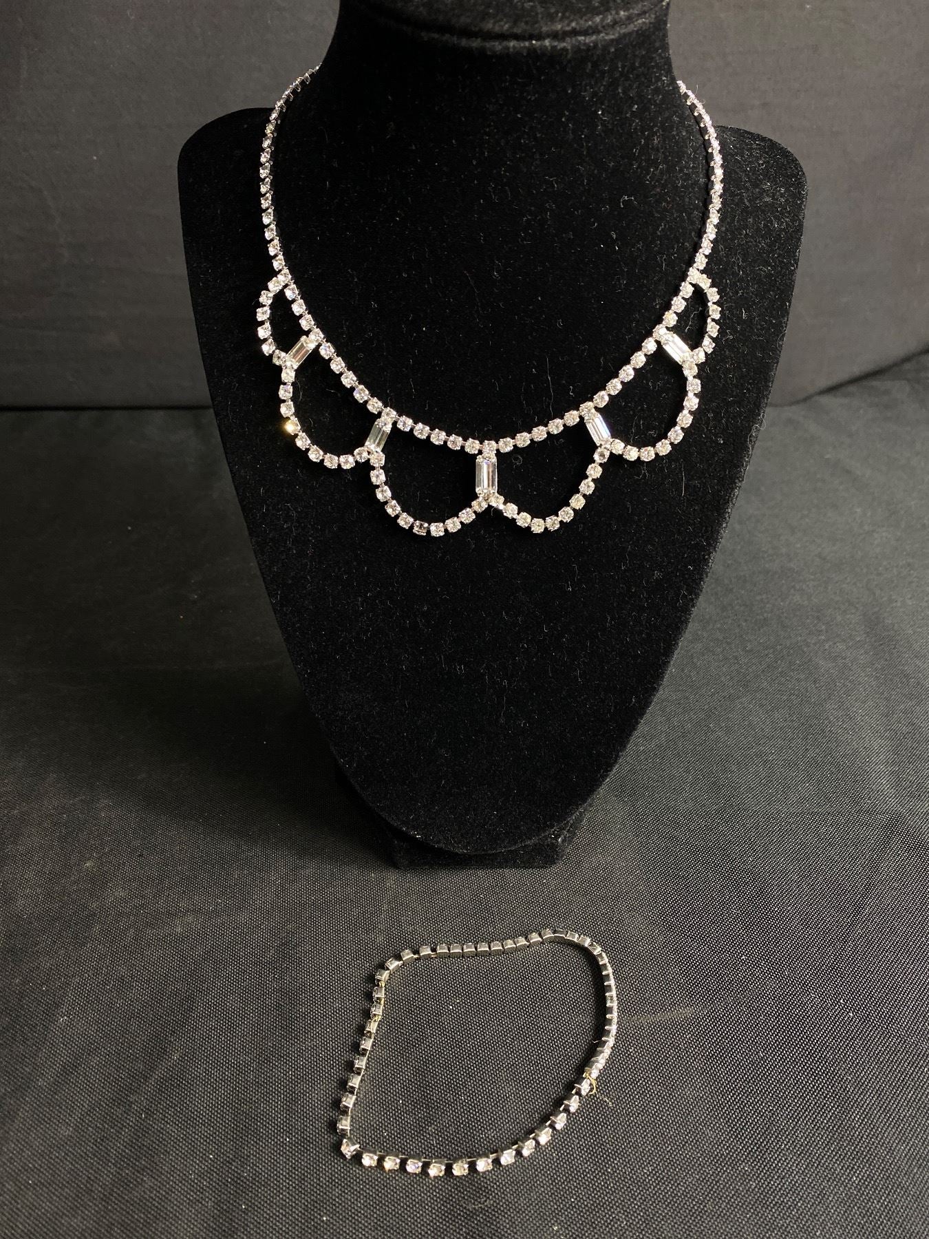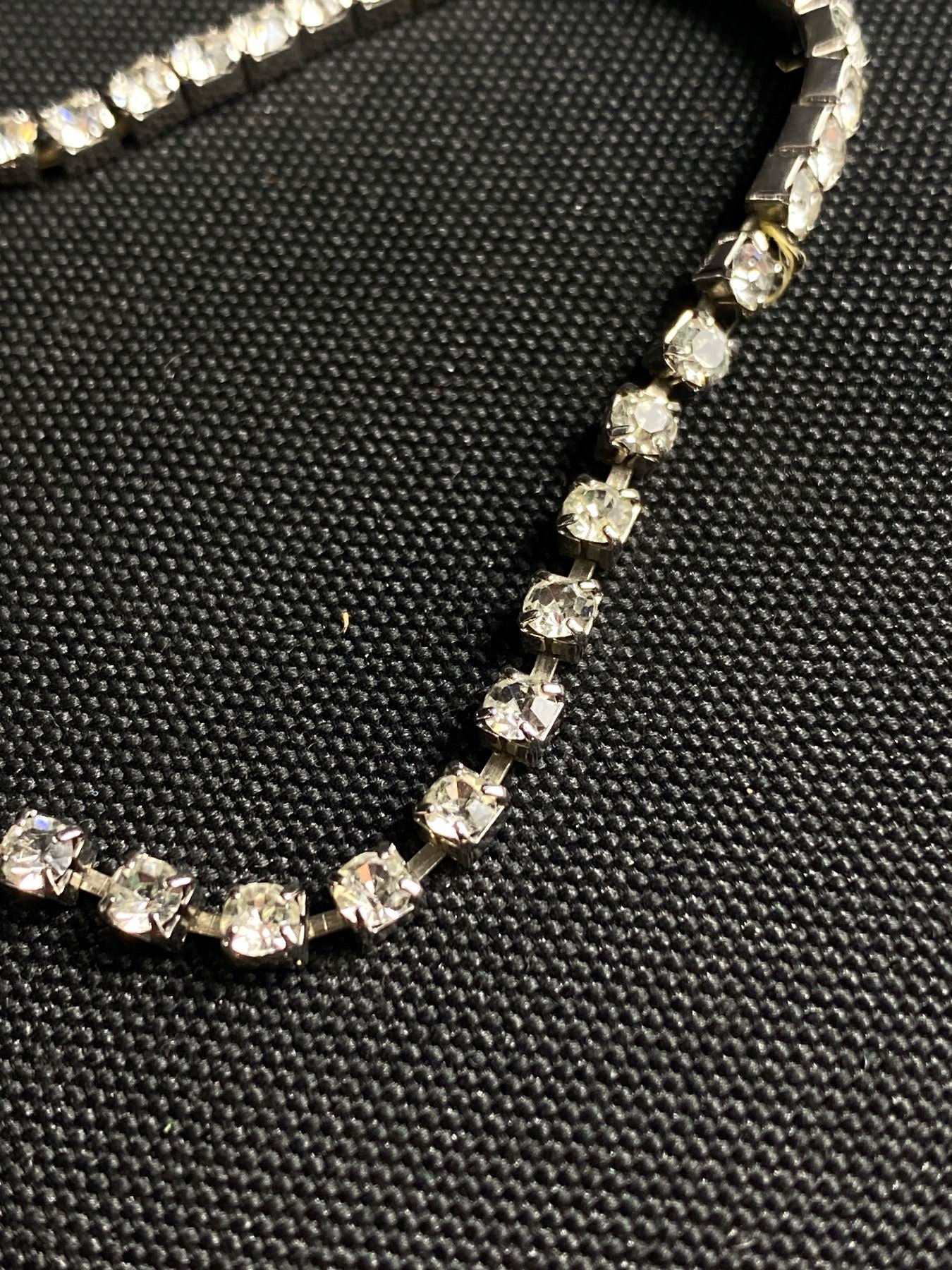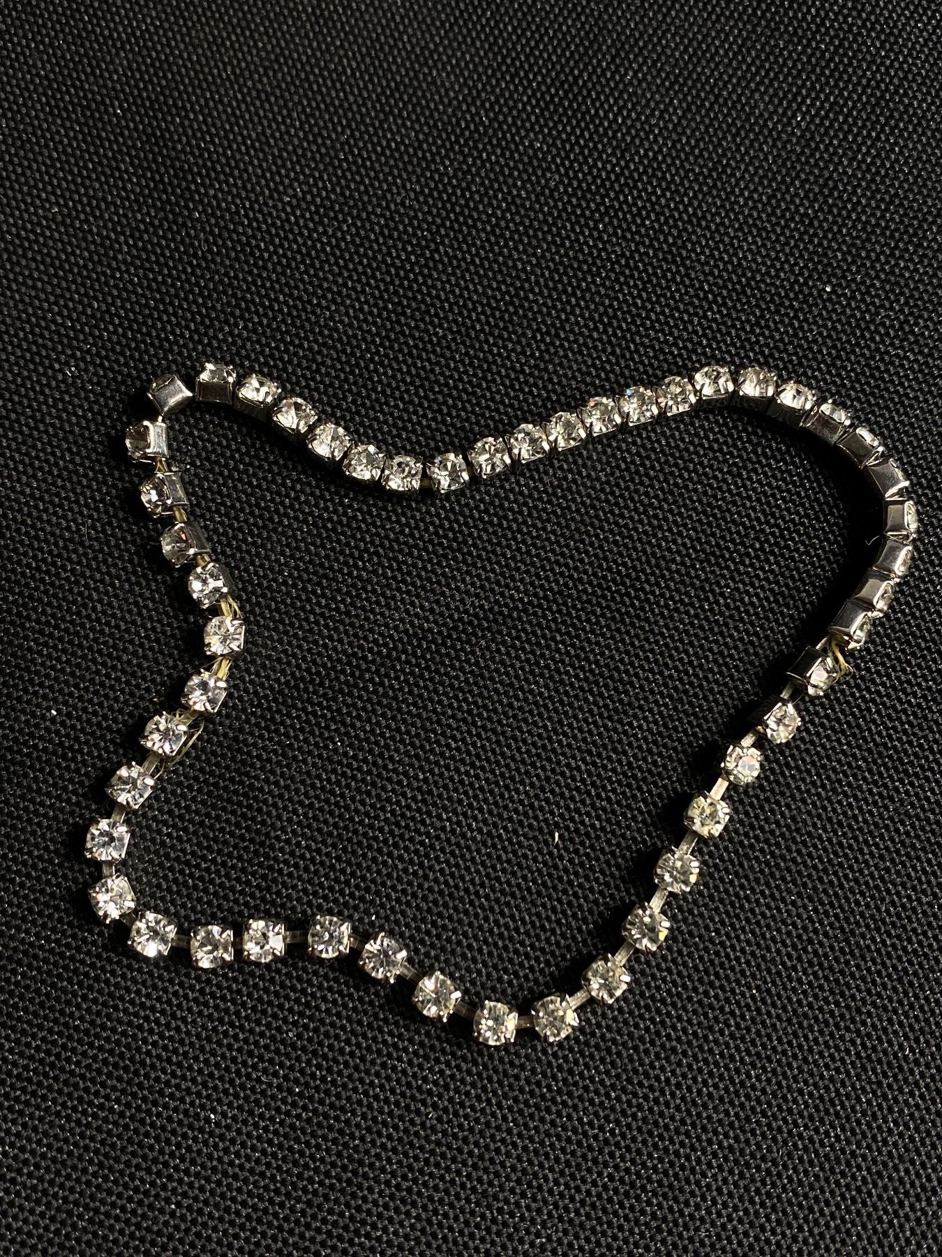 Indulge in luxury with this Vintage Very Fine Rhinestone Necklace & Bracelet. This elegant set exudes sophistication and fine craftsmanship, making it the perfect addition to any outfit. The sparkling rhinestones add a touch of glamour and elevate any look. Own a piece of vintage history with this exclusive set. π