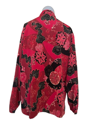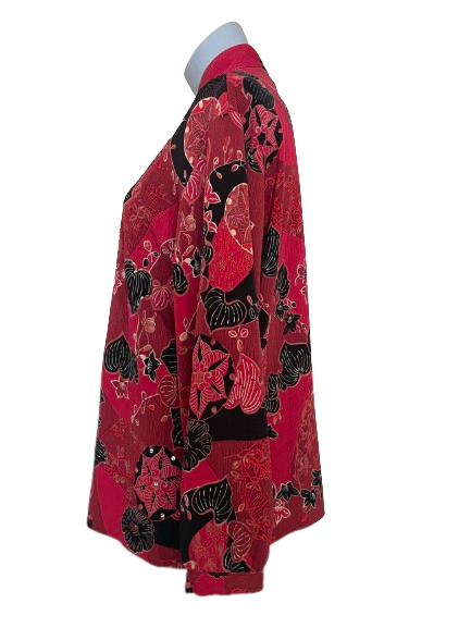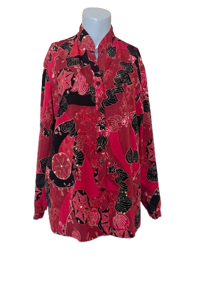 A statement piece from Alia Petites, this red and black shirt features an intricate floral pattern embellished with a mix of sequins and beading. Perfect for making a bold yet sophisticated impression.