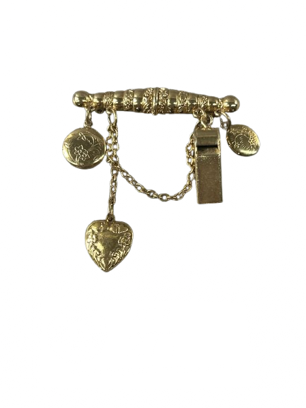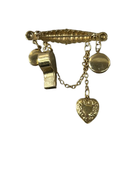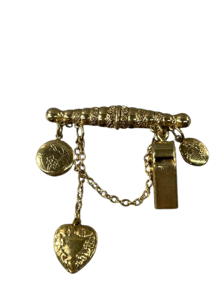 Be a trendsetter with this Chatelaine Brooch With Charms! This unique brooch features hanging charms, including a playful whistle, that add a touch of whimsy to your outfit. Make a bold statement with this must-have accessory.