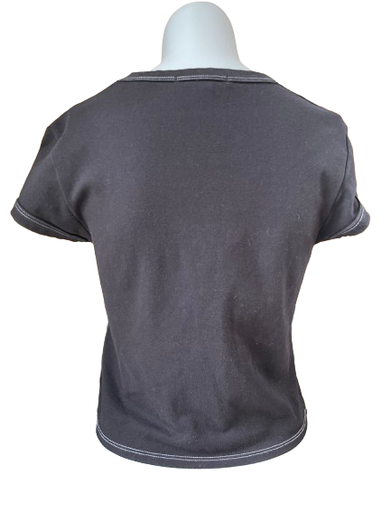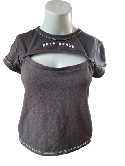Show off your punk spirit with this thrifted Forever 21 Black T-Shirt! Featuring edgy youth branding across the front and a playful chest cutout, this shirt is perfect for those who don't take themselves too seriously. Embrace your inner rebel and stand out from the crowd!