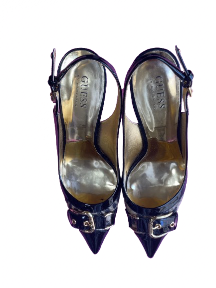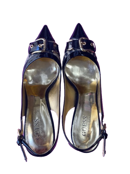 A single black Guess slingback heel with leopard print design and a buckle toe feature, displayed against a colorful background.