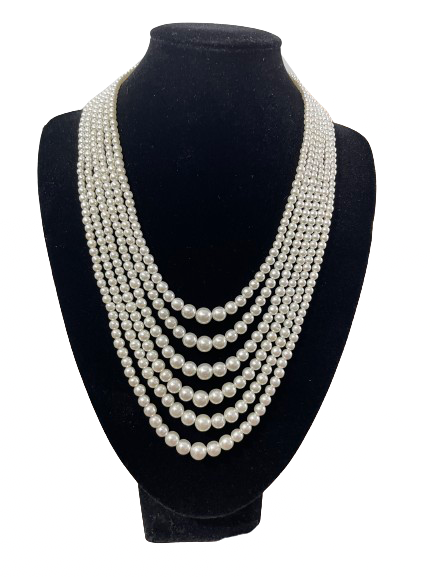 This elegant multi strand faux pearl necklace features layered strands that create a classic, timeless look with added dimension. Finished with a decorative rhinestone-accented clasp, this piece brings a touch of vintage-inspired glamour while remaining versatile enough for both casual and dressy styling. The faux pearls have a soft lustre and uniform shape, giving the necklace a polished, refined appearance.